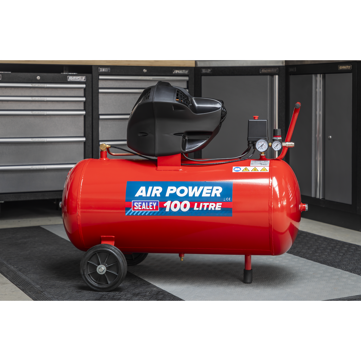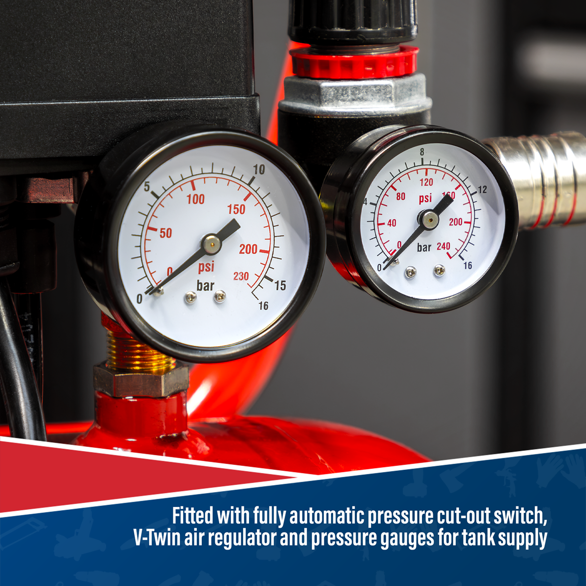 • Fitted with fully automatic pressure cut-out switch, V-Twin air regulator and pressure gauges for tank and supply.