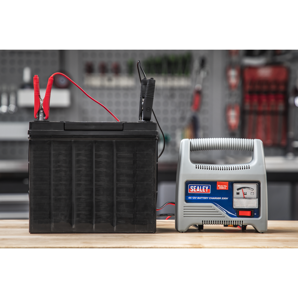 • Compact 12V lead acid battery charger suitable for home and light workshop use.