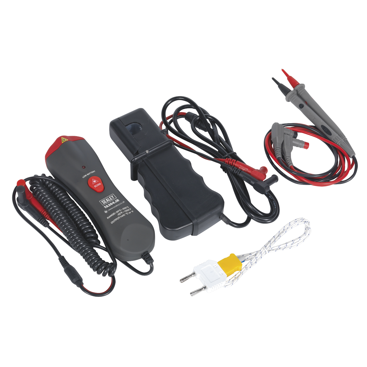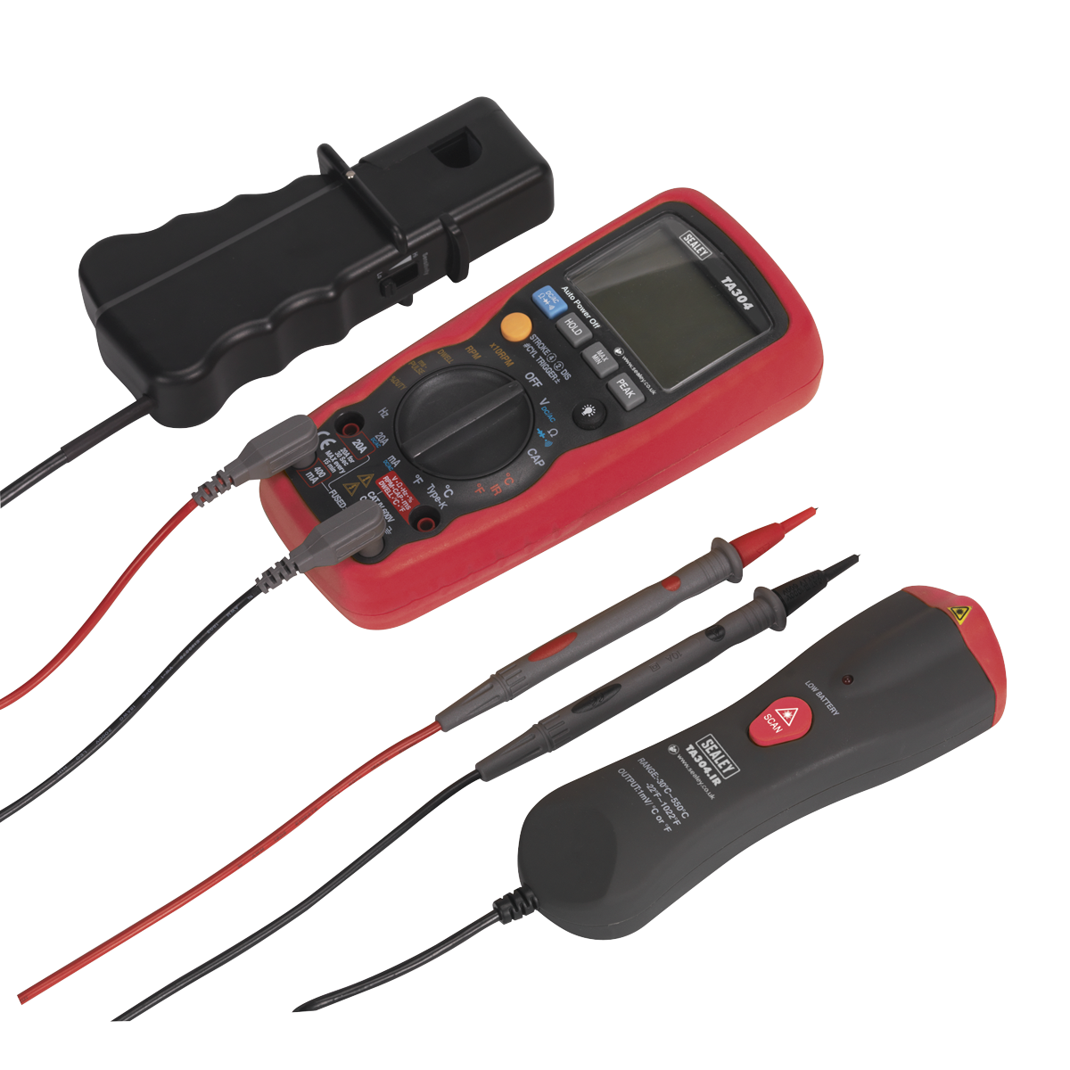• 15-Function, auto-ranging automotive diagnostic multimeter with infrared thermometer attachment.