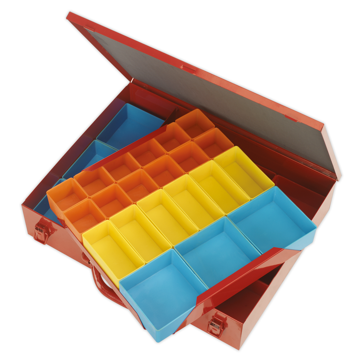 • Tough and durable metal case featuring twenty seven plastic removable bins in two layers, divided by metal tray.