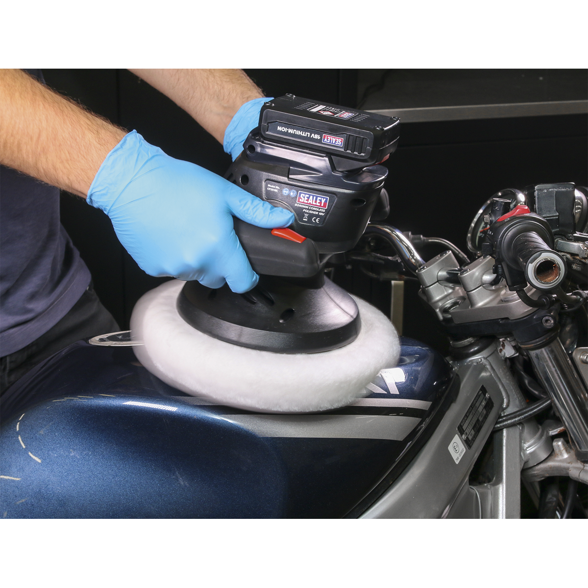 • Cordless random orbital polisher with Ø240mm foam backing pad and polishing bonnet.