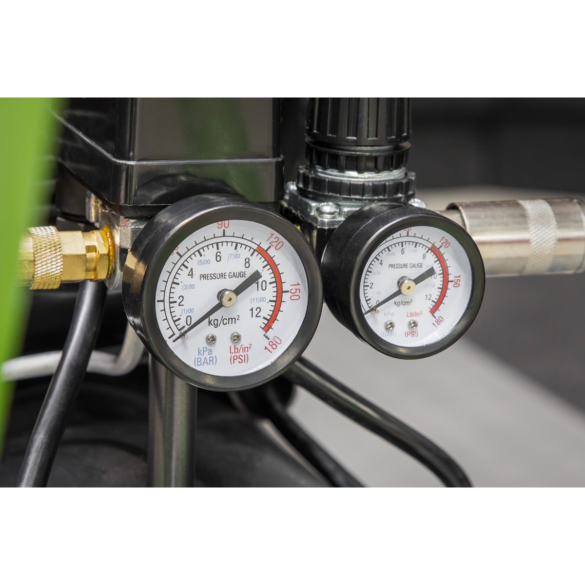 • Fitted with fully automatic pressure cut-out switch and twin gauges displaying tank and working pressures.