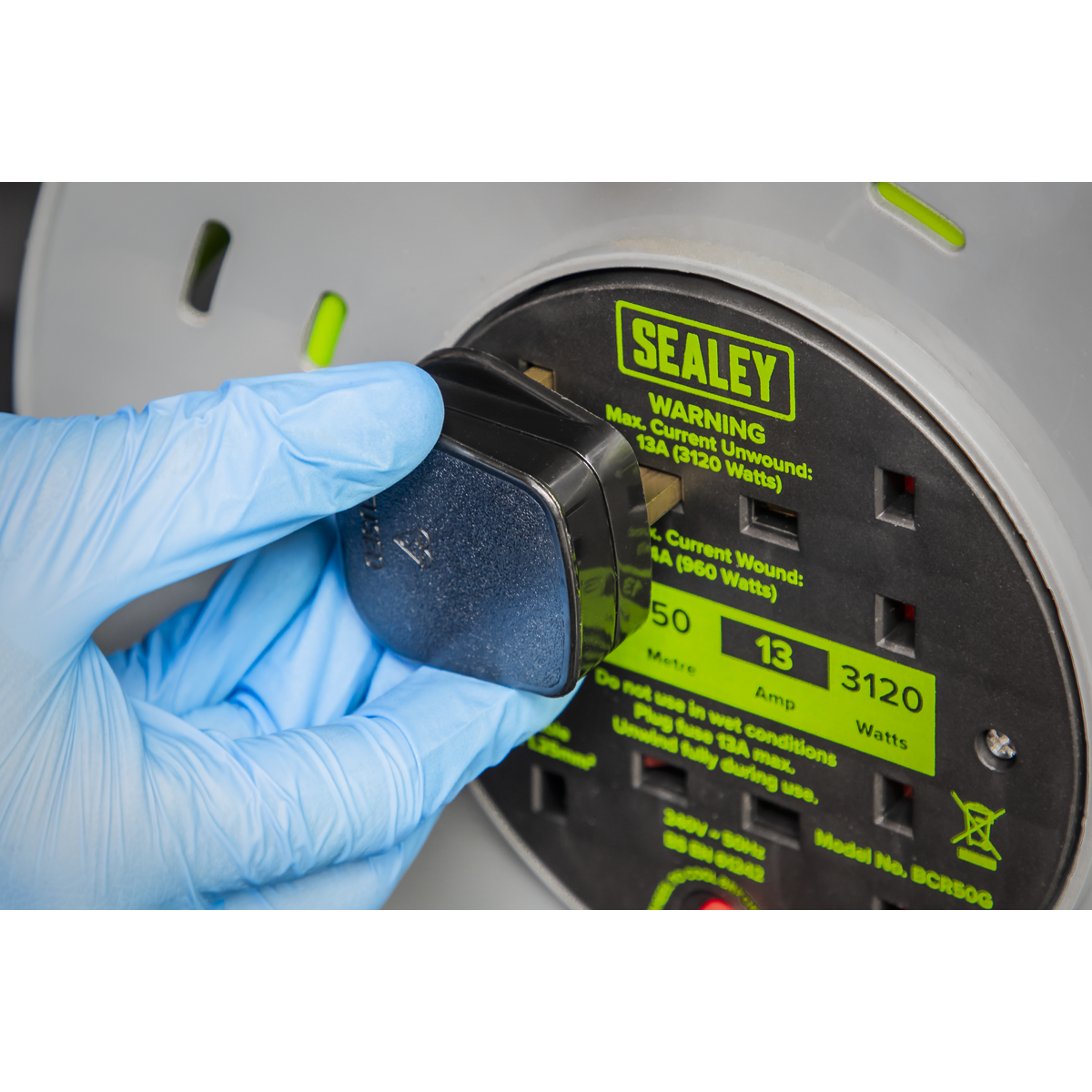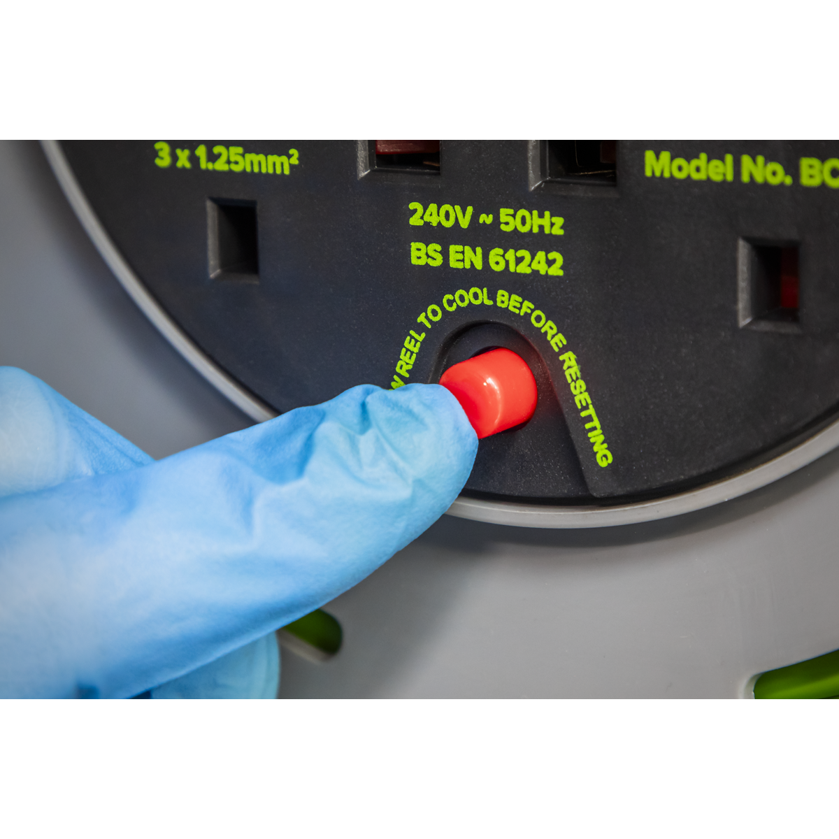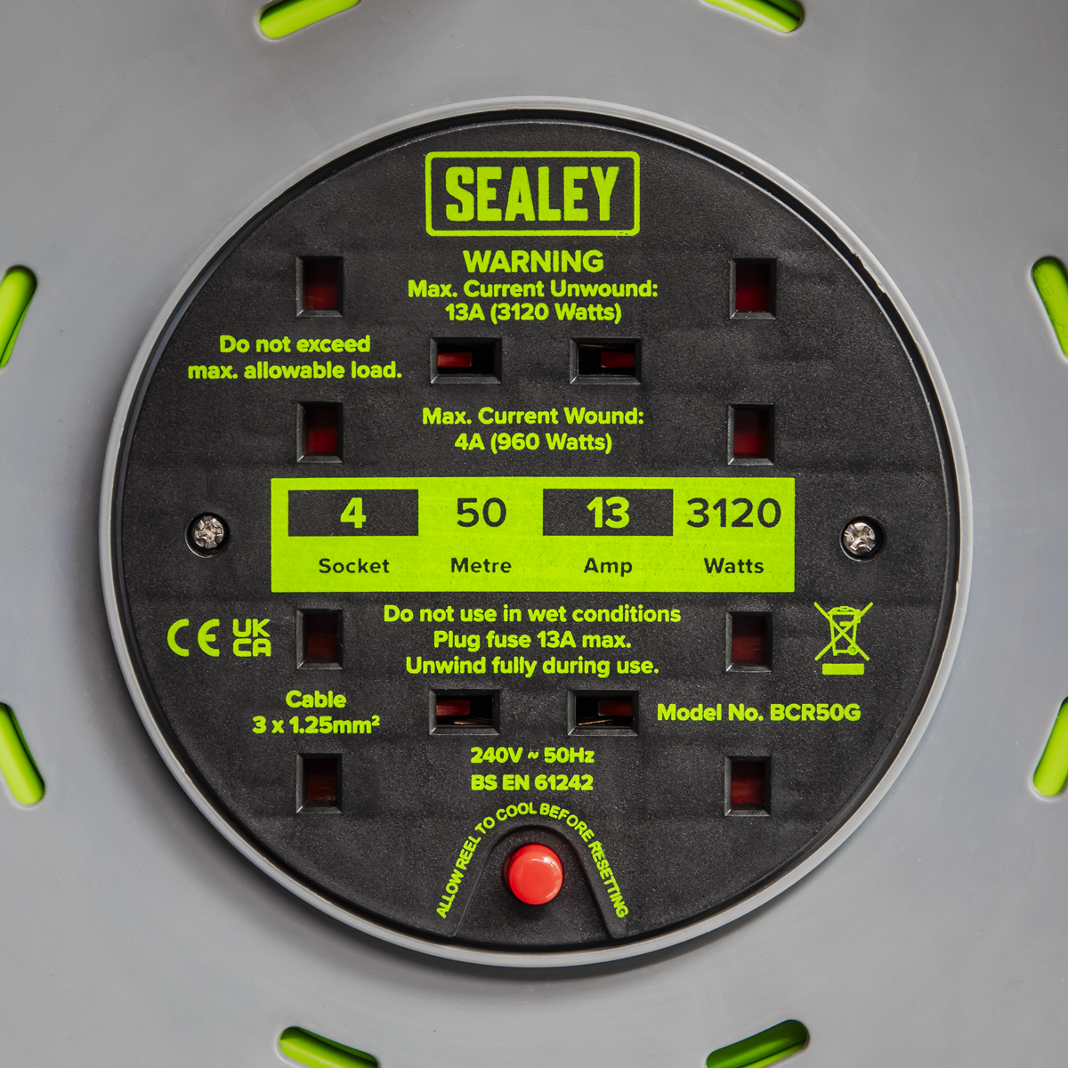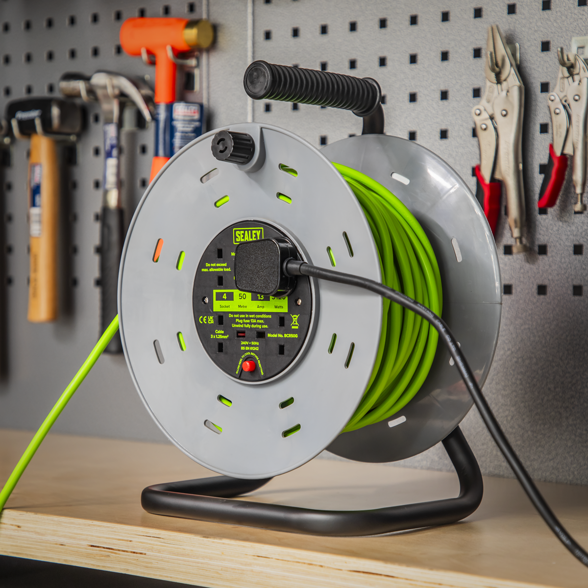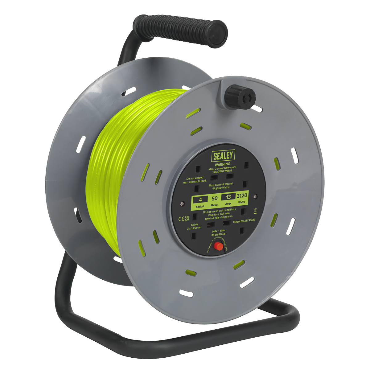 50m Cable Reel with Thermal Trip 4 x 230V - Hi-Vis Green