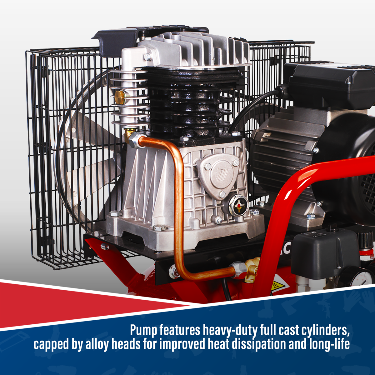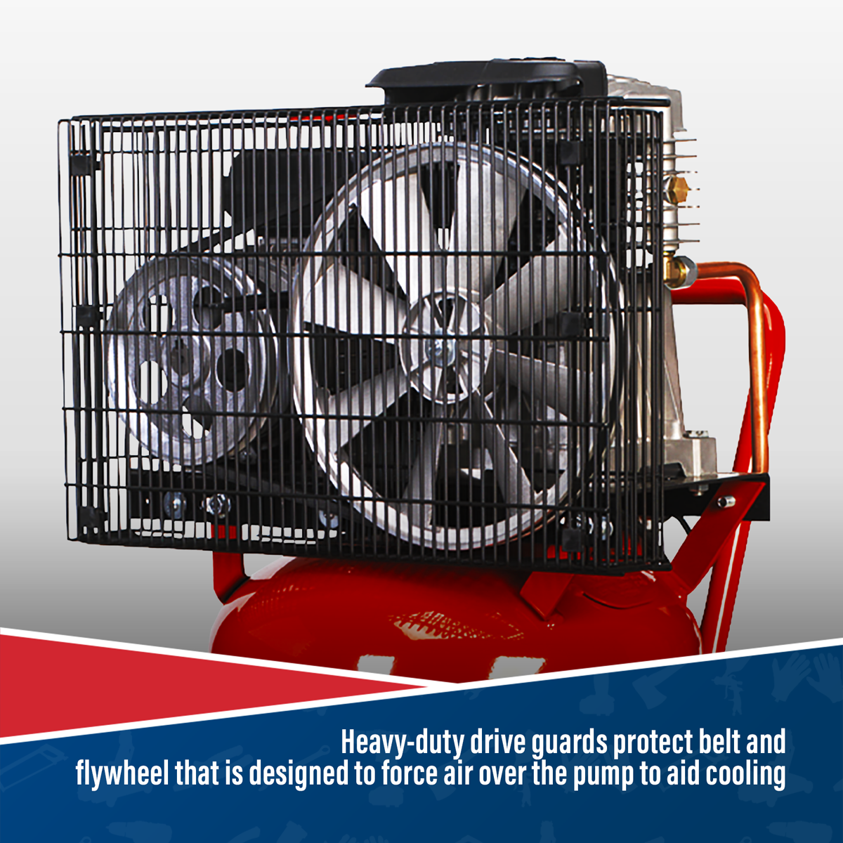 • Heavy-duty drive guards protect belt and flywheel that is designed to force air over the pump to aid cooling.