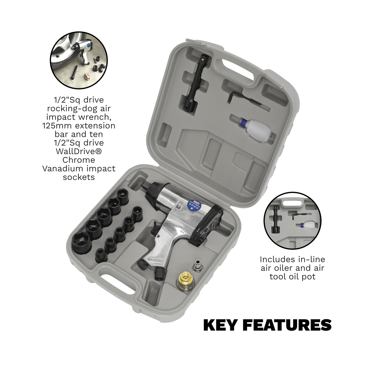• Comprises 1/2"Sq drive rocking-dog air impact wrench, 125mm extension bar and ten 1/2"Sq drive WallDrive® Chrome Vanadium impact sockets; 9, 10, 11, 13, 14, 17, 19, 22, 24, 27mm.