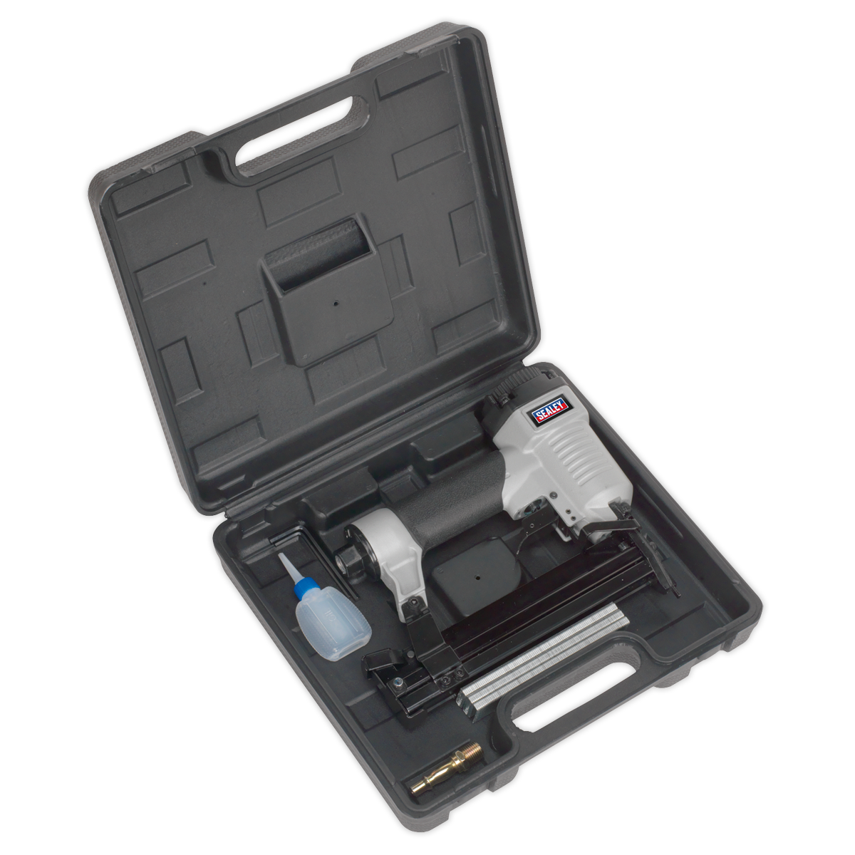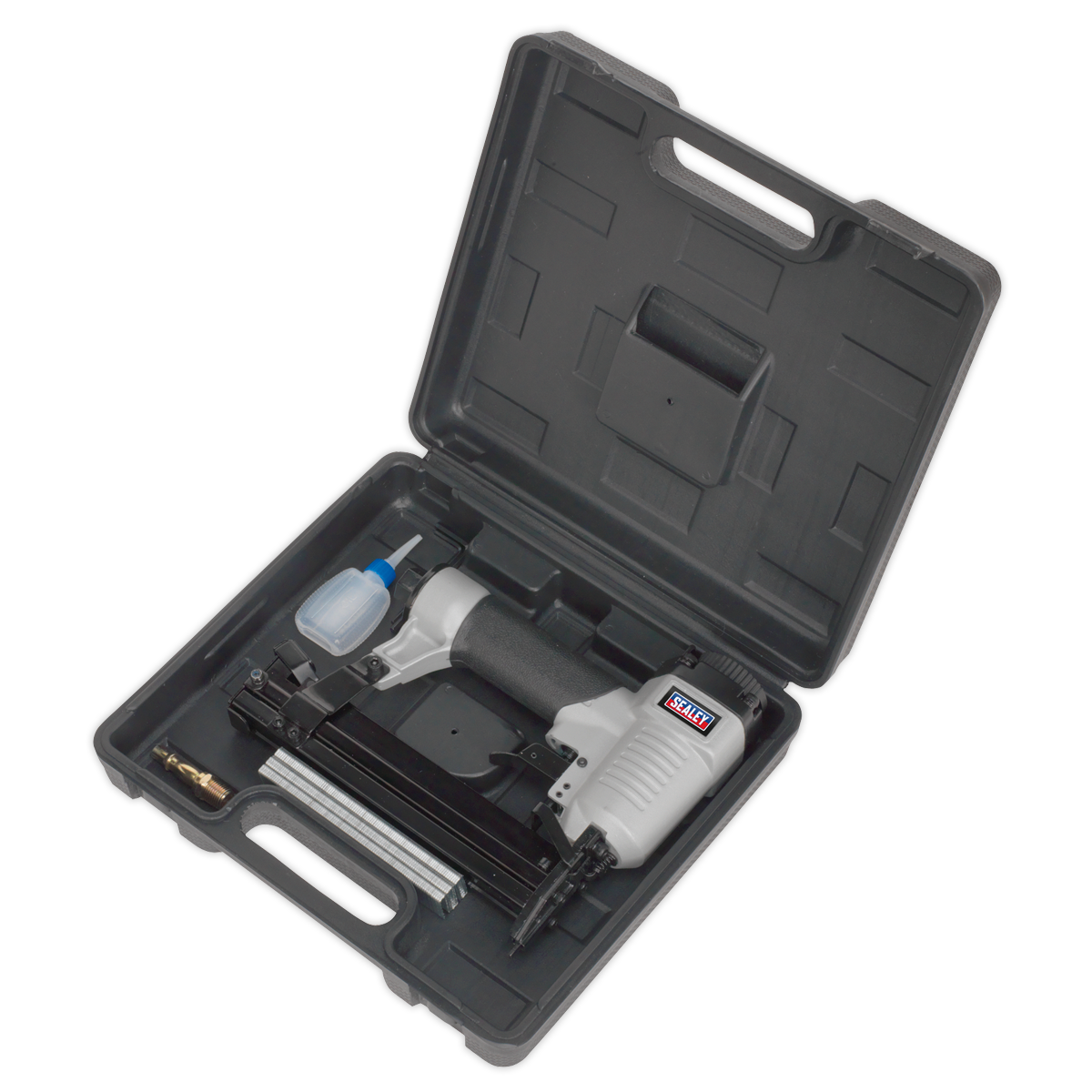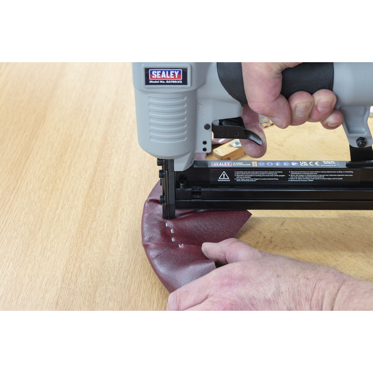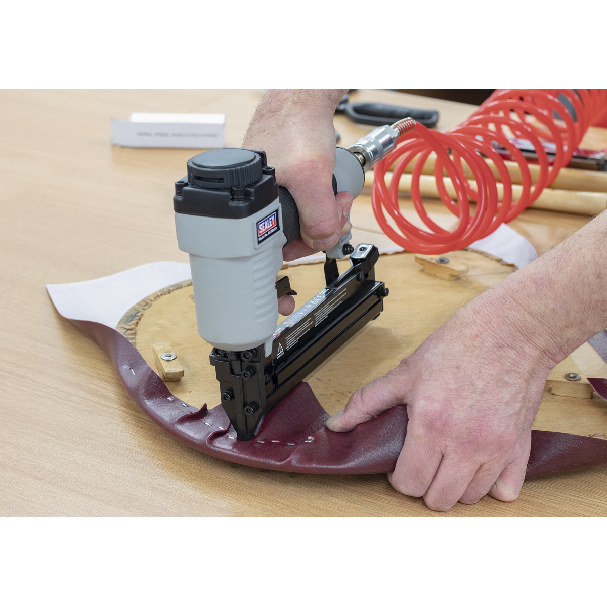 • Professional air stapler with lightweight aluminium body and rubber grip handle.