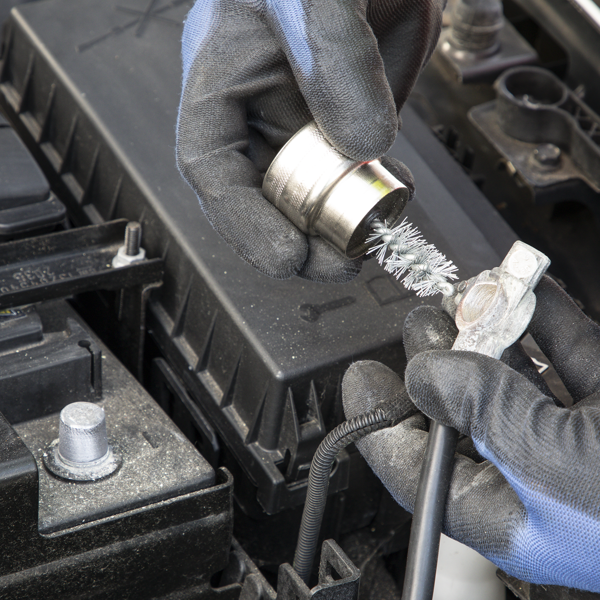 • Wire brushes remove corrosion build-up on battery posts and terminals for improved electrical contact.