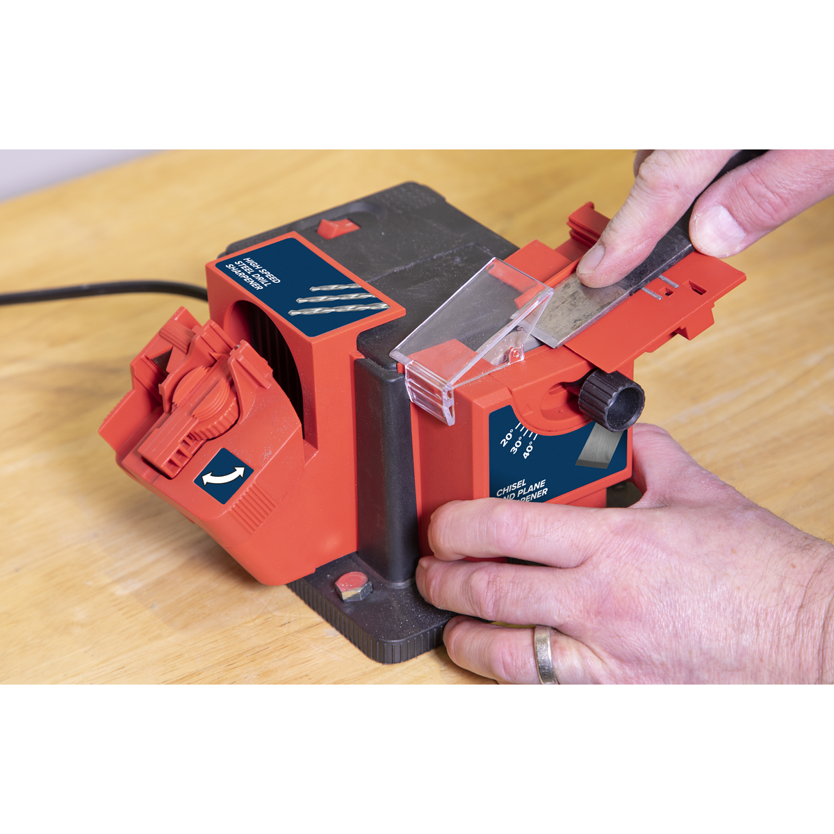 • Sharpens all HSS drill bits from Ø3-13mm, straight edged knives and scissors.