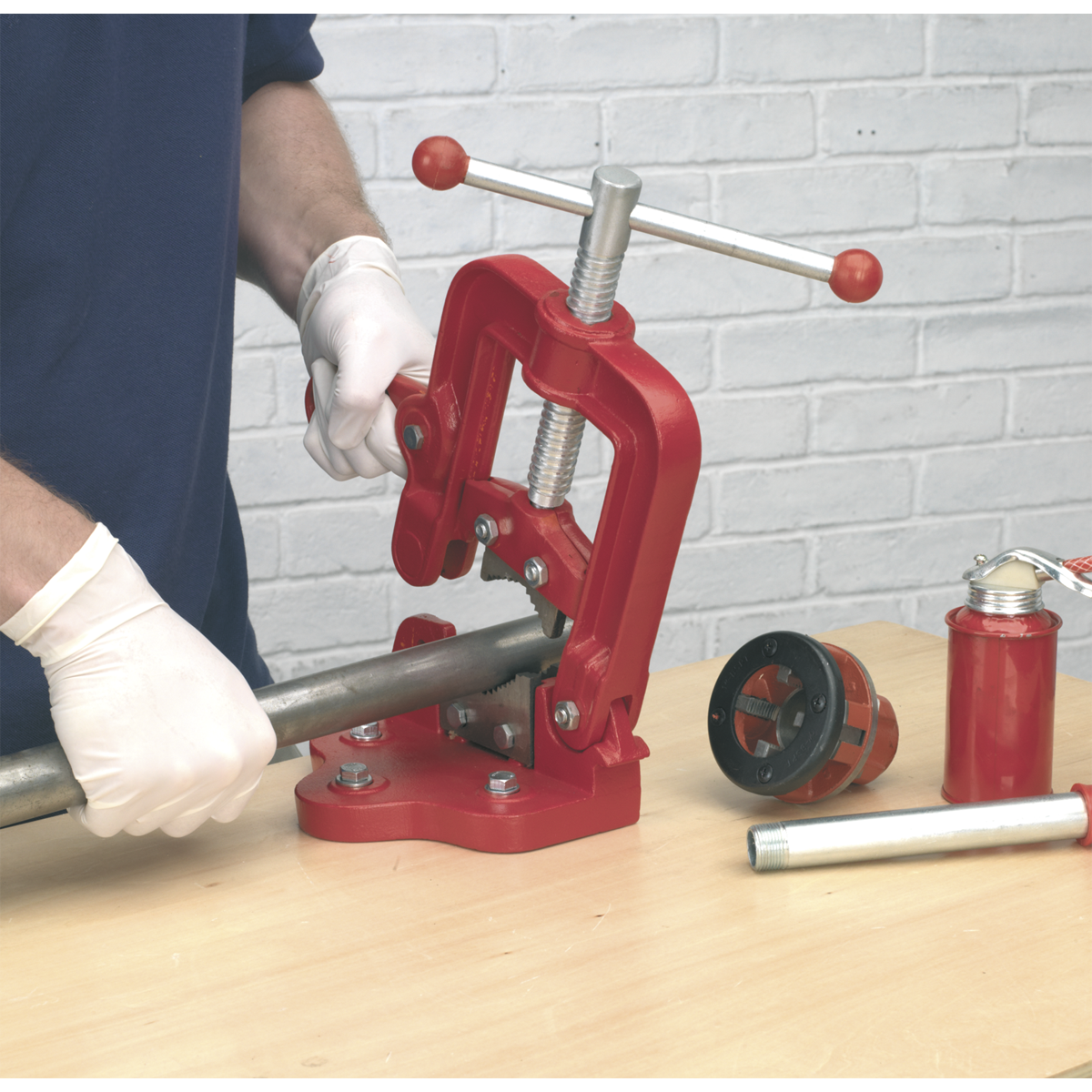 • Hinged design for easy insertion of pipe into vice.