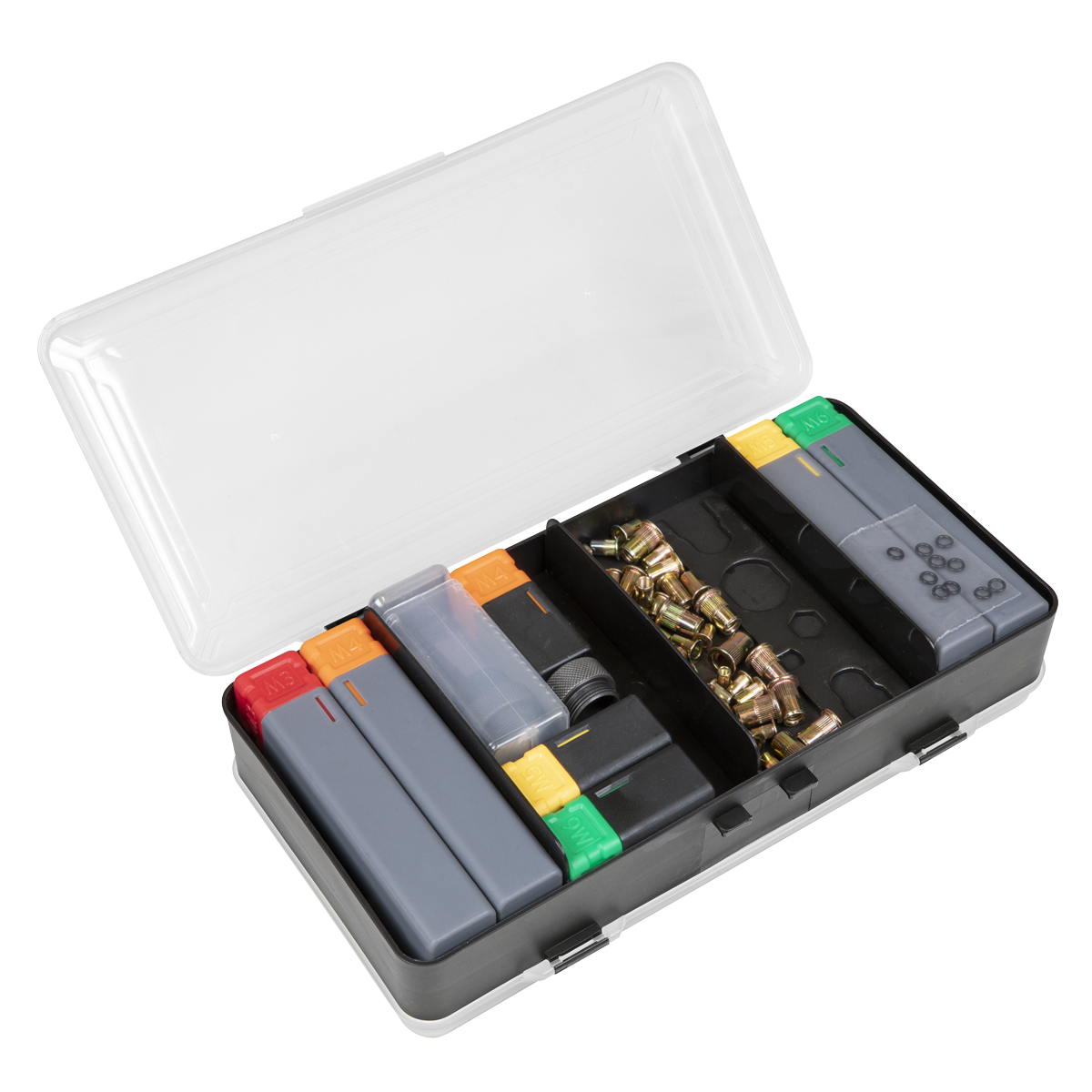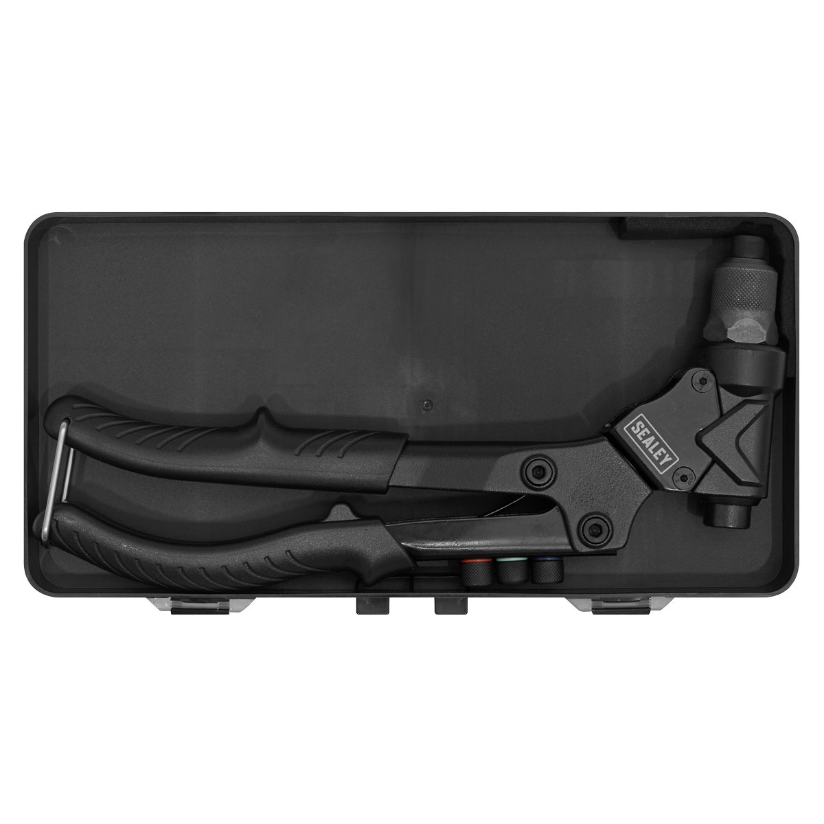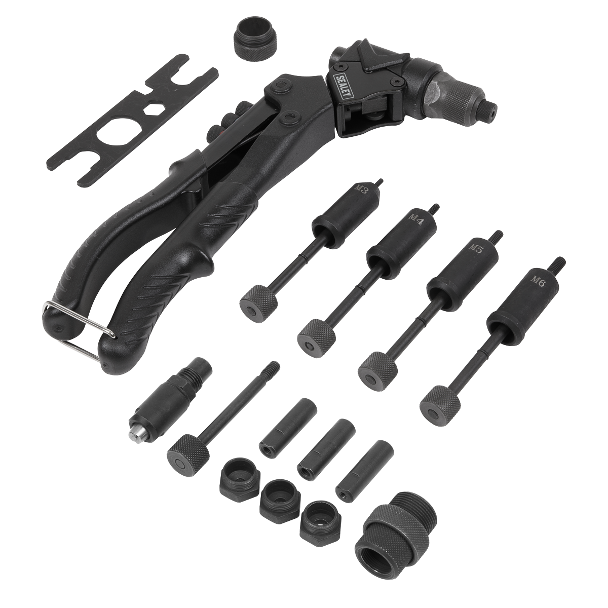 • COMPONENTS - Four nozzles for blind rivets, four mandrels for rivet nuts and three mandrels for rivet studs. Supplied with spanners and a selection of steel rivet nuts.