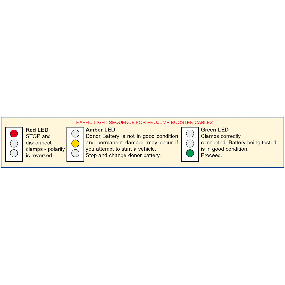 • Clever traffic-light LEDs show when protection is in place and it is safe to proceed jump-starting.