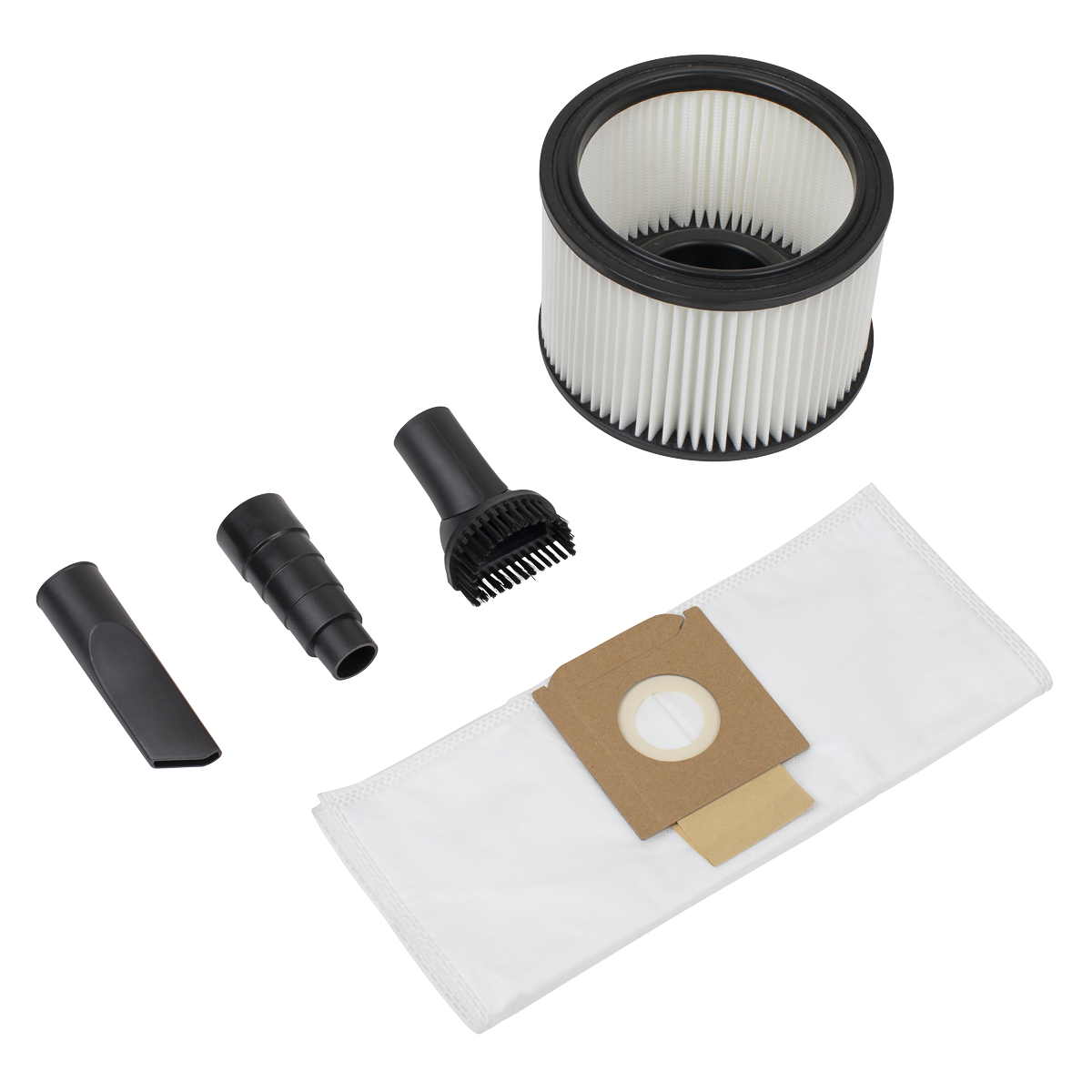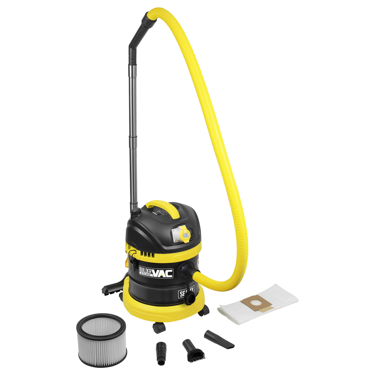 • ACCESSORIES - Fitted with 5m cable and 1.5m suction hose. Supplied with three aluminium extension tubes, cartridge filter, wet-use foam filter, dust collection bag, power tool adapter, floor brush, crevice tool and round brush.