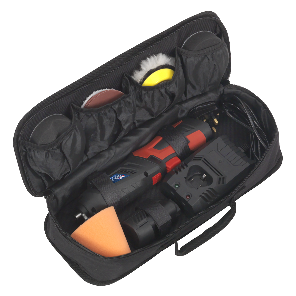 • Supplied in canvas bag with 12V lithium-ion battery pack, battery charger and a range of polishing and sanding heads.
