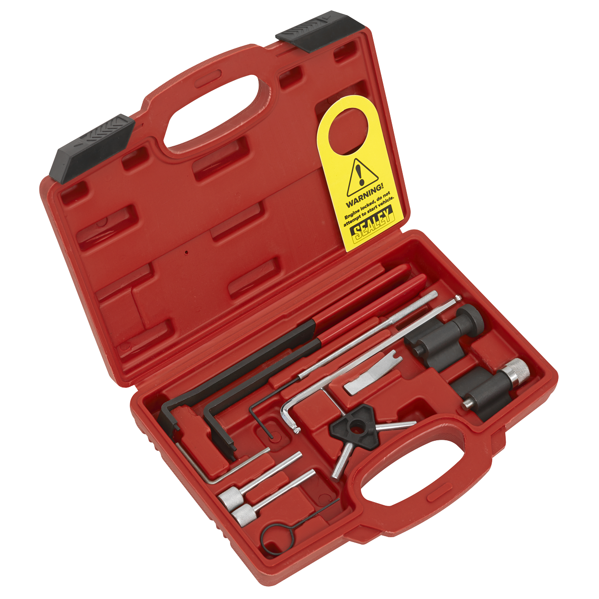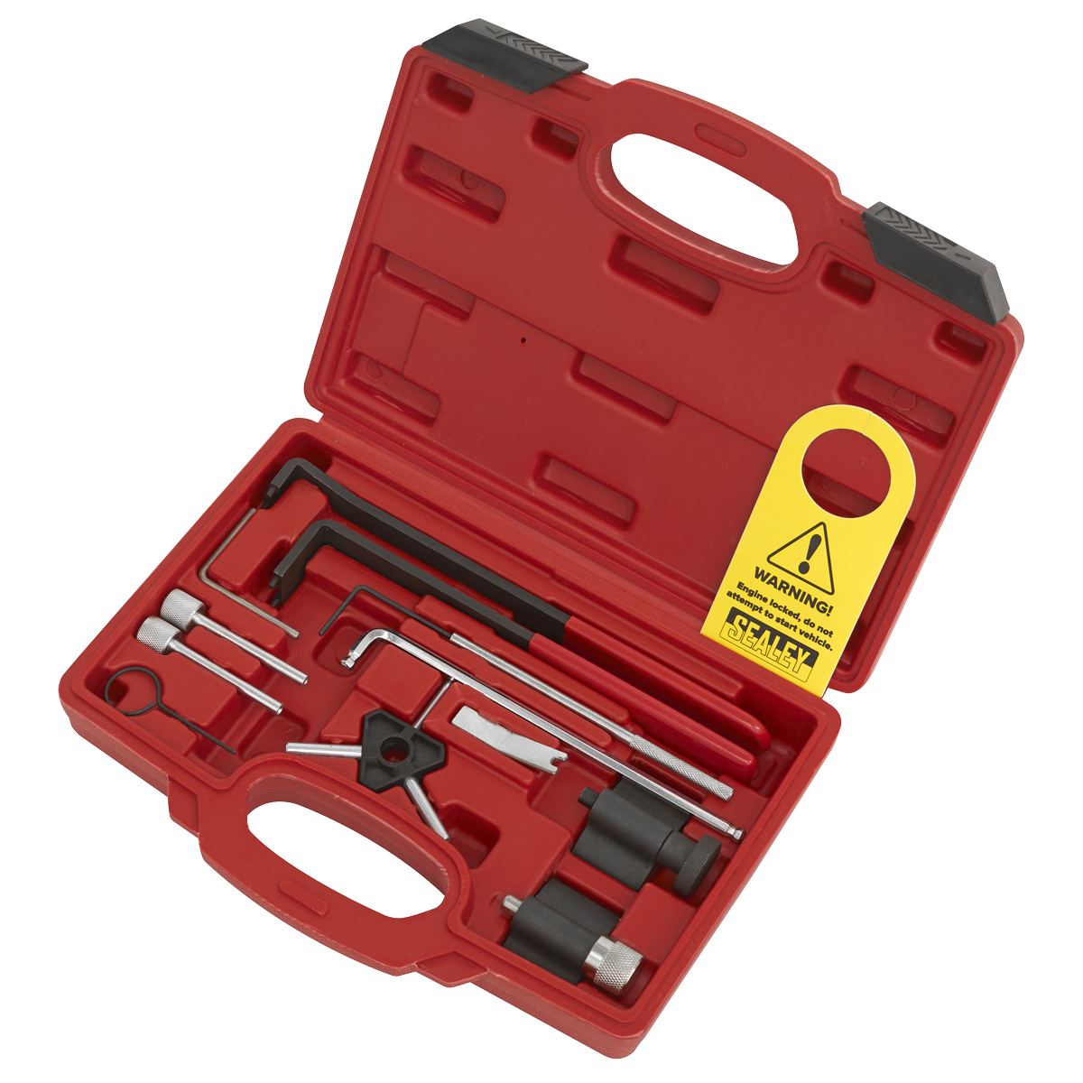 • LOCKING TOOLS - Contains crankshaft locking tools for both oval and round crank gears, camshaft locking pins and tensioner adjustment tools.