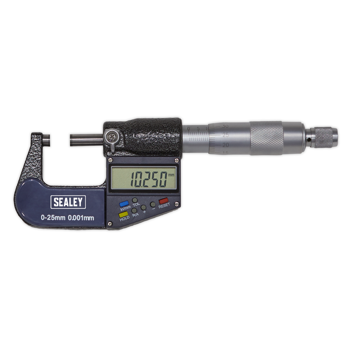 • 7-Button digital micrometer with satin chrome thimble and sleeve.
