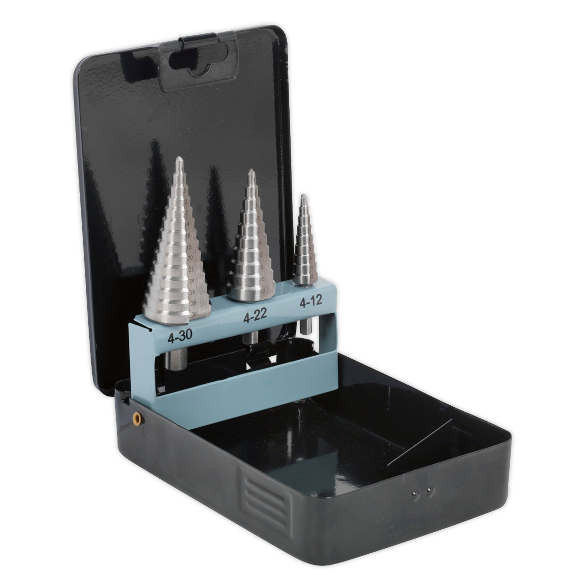 • Three high-speed HSS 4341 double flute step drills.