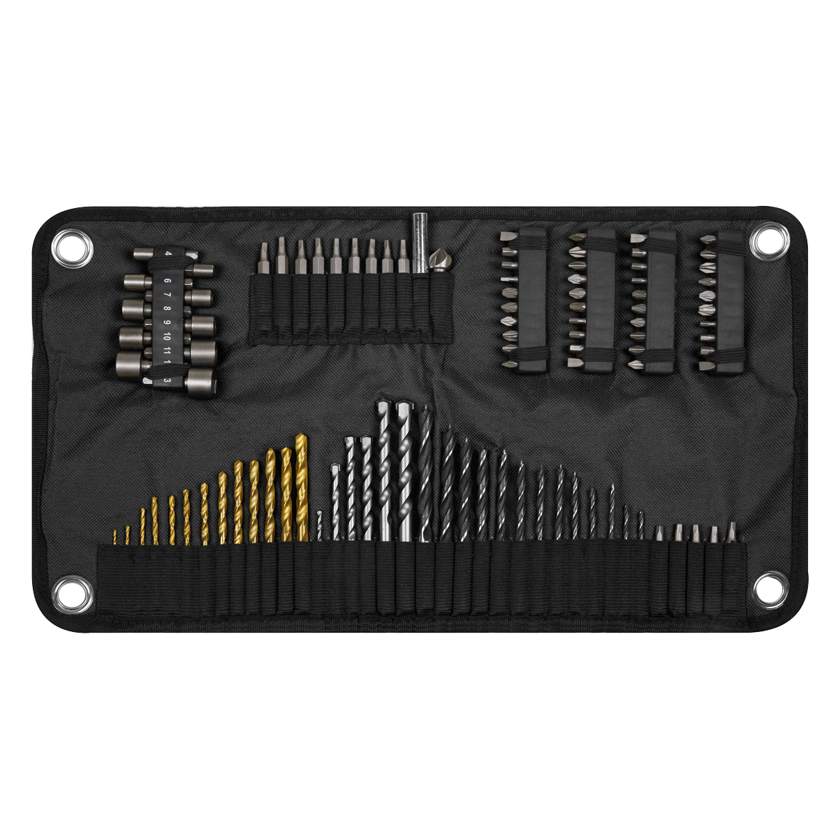 • Contents: Drill Bits; HSS Coated - Ø1.5, 2, 2.5, 3, 3.2, 3.5, 4, 4.5, 4.8, 5, 5.5, 6, 6.5mm, Masonry - Ø3, 5.5, 6, 7, 8, 10mm, Wood - Ø3, 3.2, 3.5, 4, 4.5, 4.8, 5, 5.5, 6, 6.5, 7, 7.5, 8mm, 25mm Bits; Slotted - 4, 5, 6, 7mm, Phillips - #0 (x2), #1 (x2), #2 (x3), #3 (x2), Pozi - #0 (x2), #1 (x3), #2 (x4), #3 (x2), TRX-Star* - T10, T15, T20, T25, T27, T30, Hex - 3, 4 (x2), 5 (x2), 6mm, Square Drive - Sq1, Sq2, Sq3, 50mm Bits; Slotted - 4, 6, 7mm, Phillips - #0, # 1, #2, #3, Pozi - #1, #2 (x2), #3, TRX-Star* - T10, T15, T20, Nut Drivers; 5 (x2), 6, 7, 8, 9, 10, 11, 12, 13mm, Stainless Steel Bit Holder, Countersink Bit.