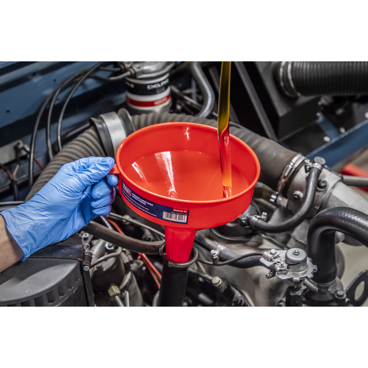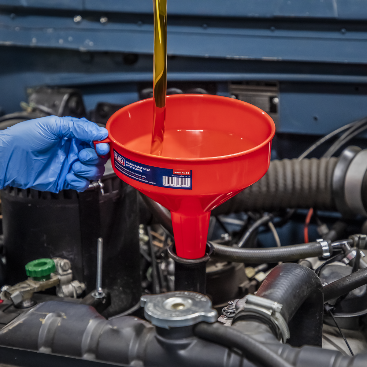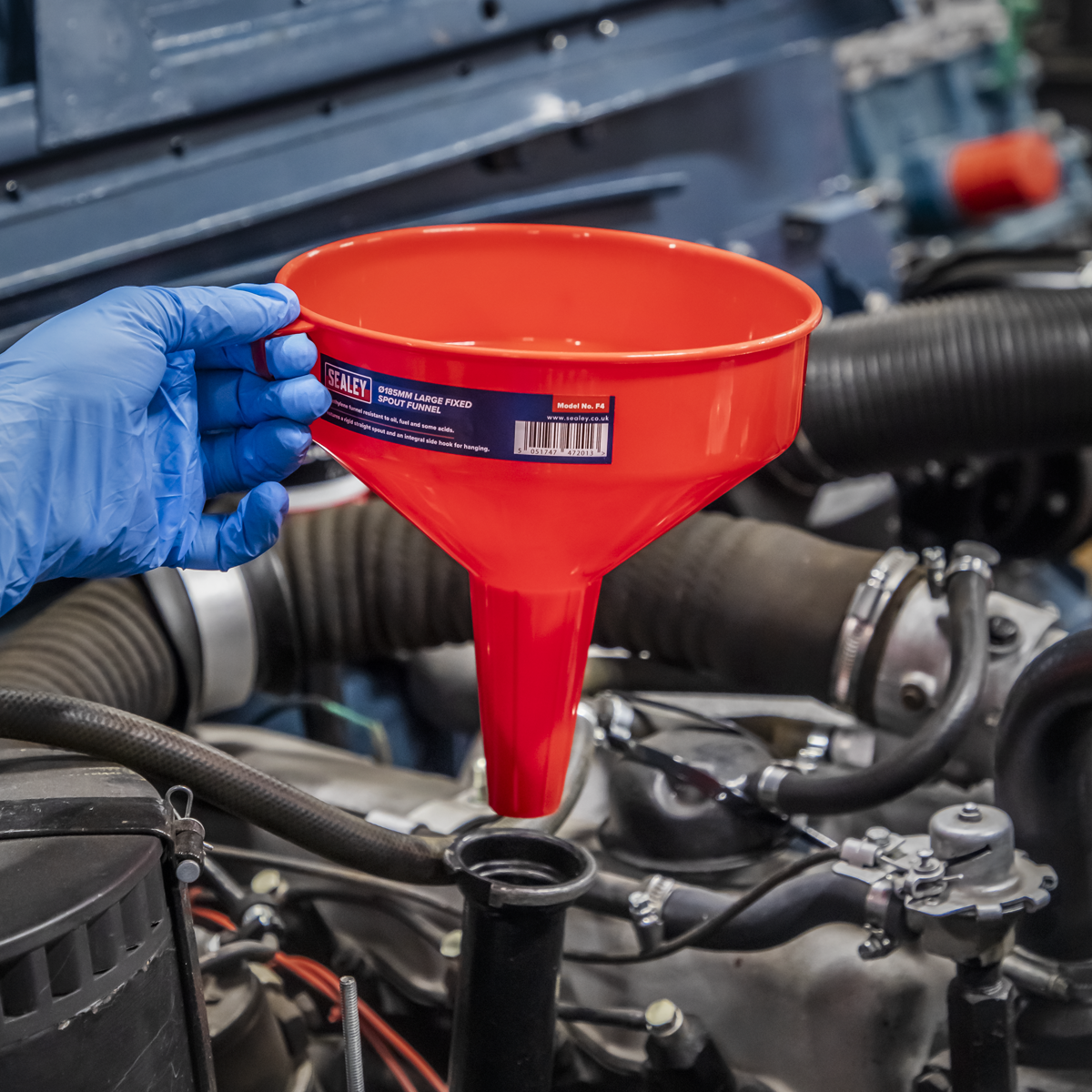 • Polyethylene funnel resistant to oil, fuel and some acids.