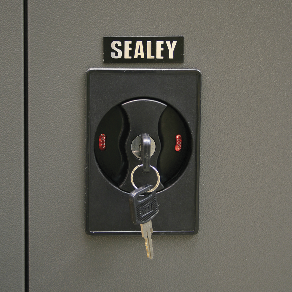 • Featuring two large doors, three half shelves, one full shelf, clothes hanger and divided base storage.
