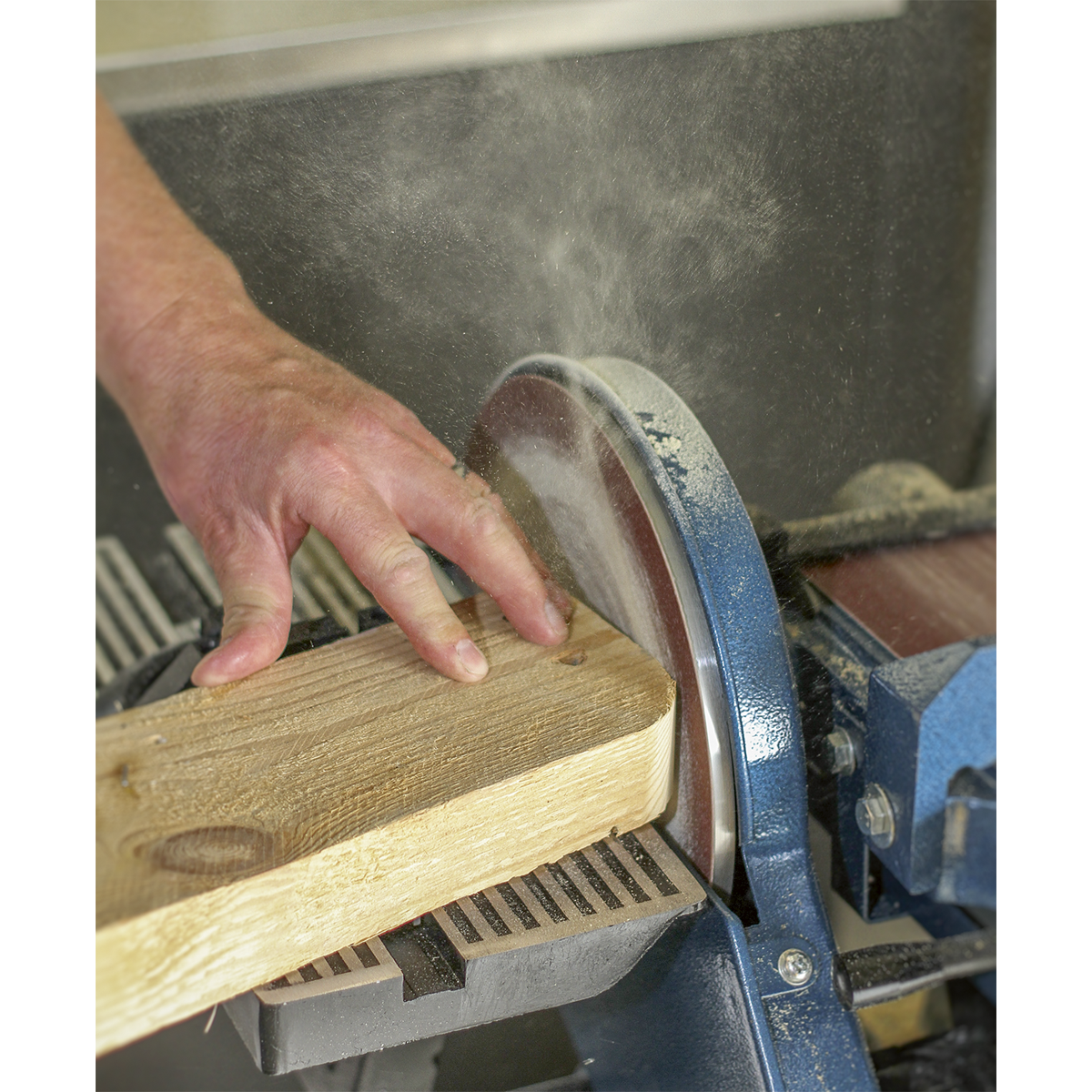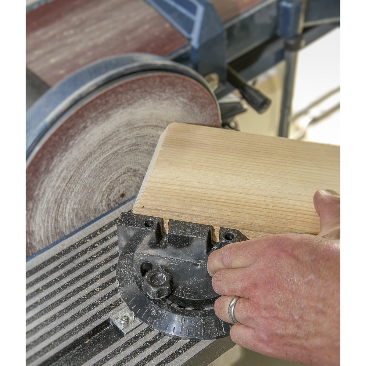 • Sanding disc table tilts up to 45° and is supplied with mitre gauge for accurate angle sanding.