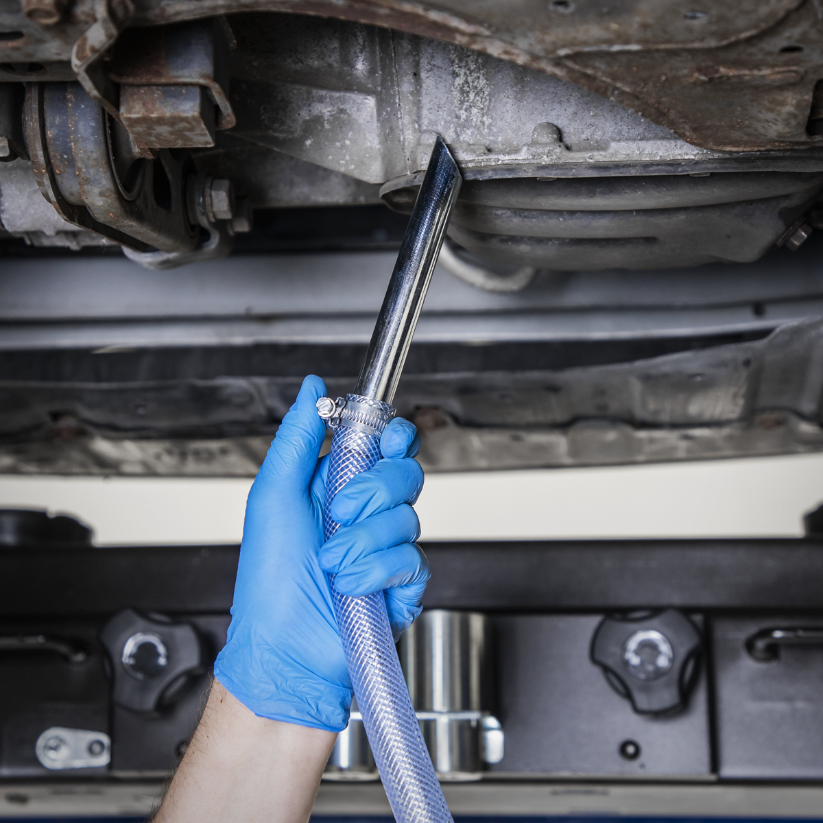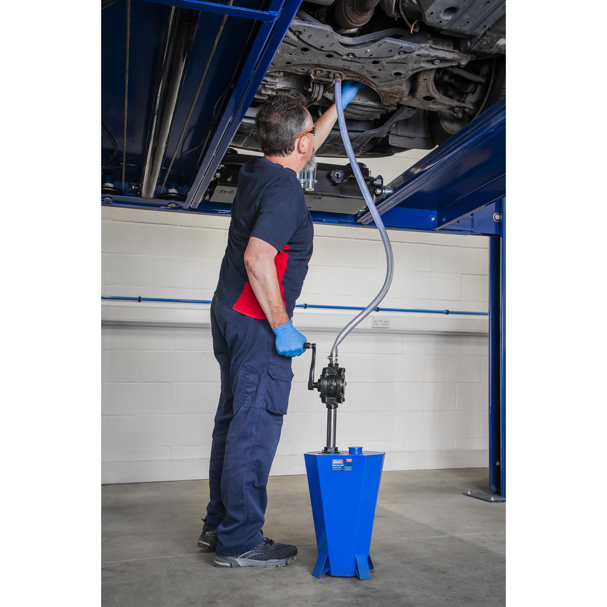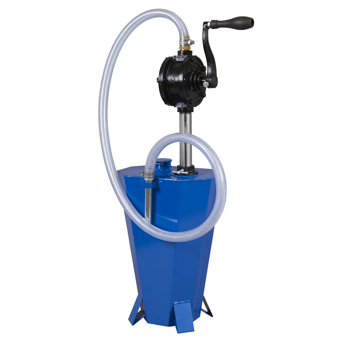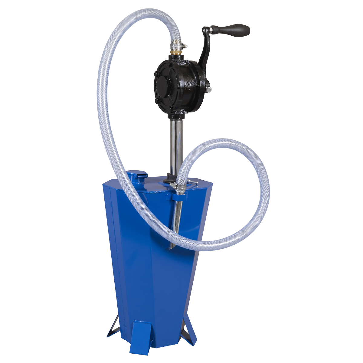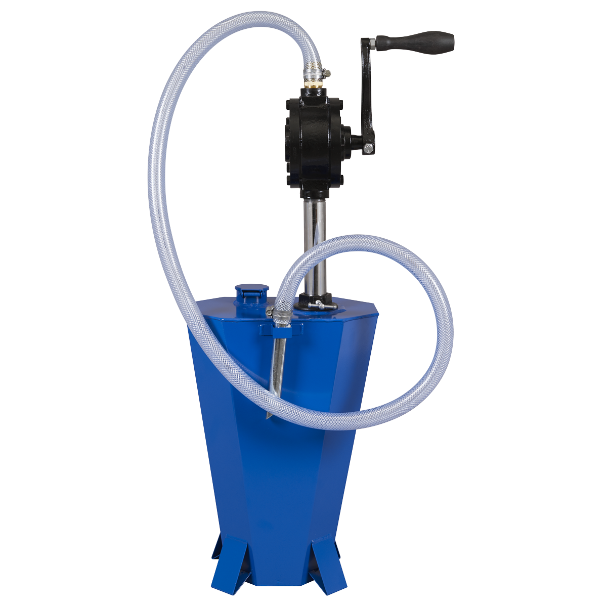 • Rotary type pump with clear, plastic tube delivers and retrieves oils and fluids.