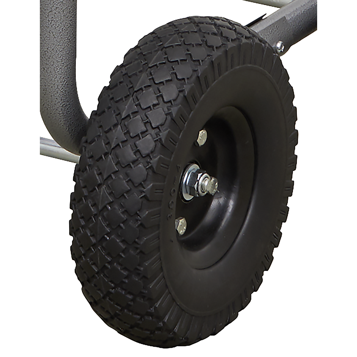 • Fitted with easy-rolling 10" puncture proof PU wheels and solid axle for rough terrain.