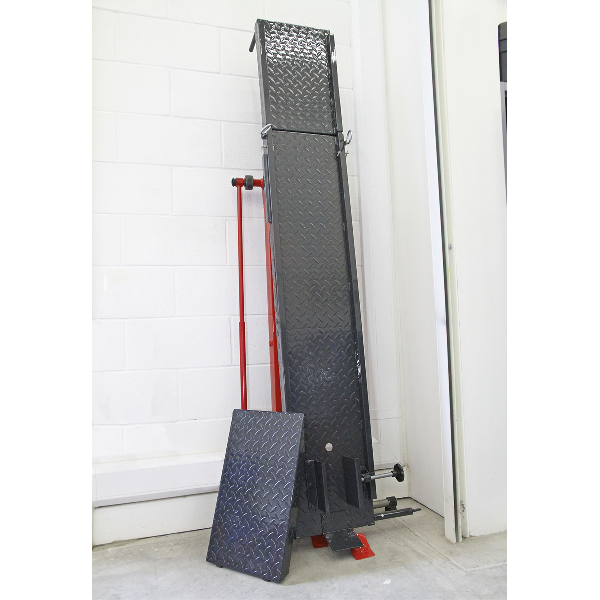 • All steel construction with foot operated, integral hydraulic pump and ram assembly.