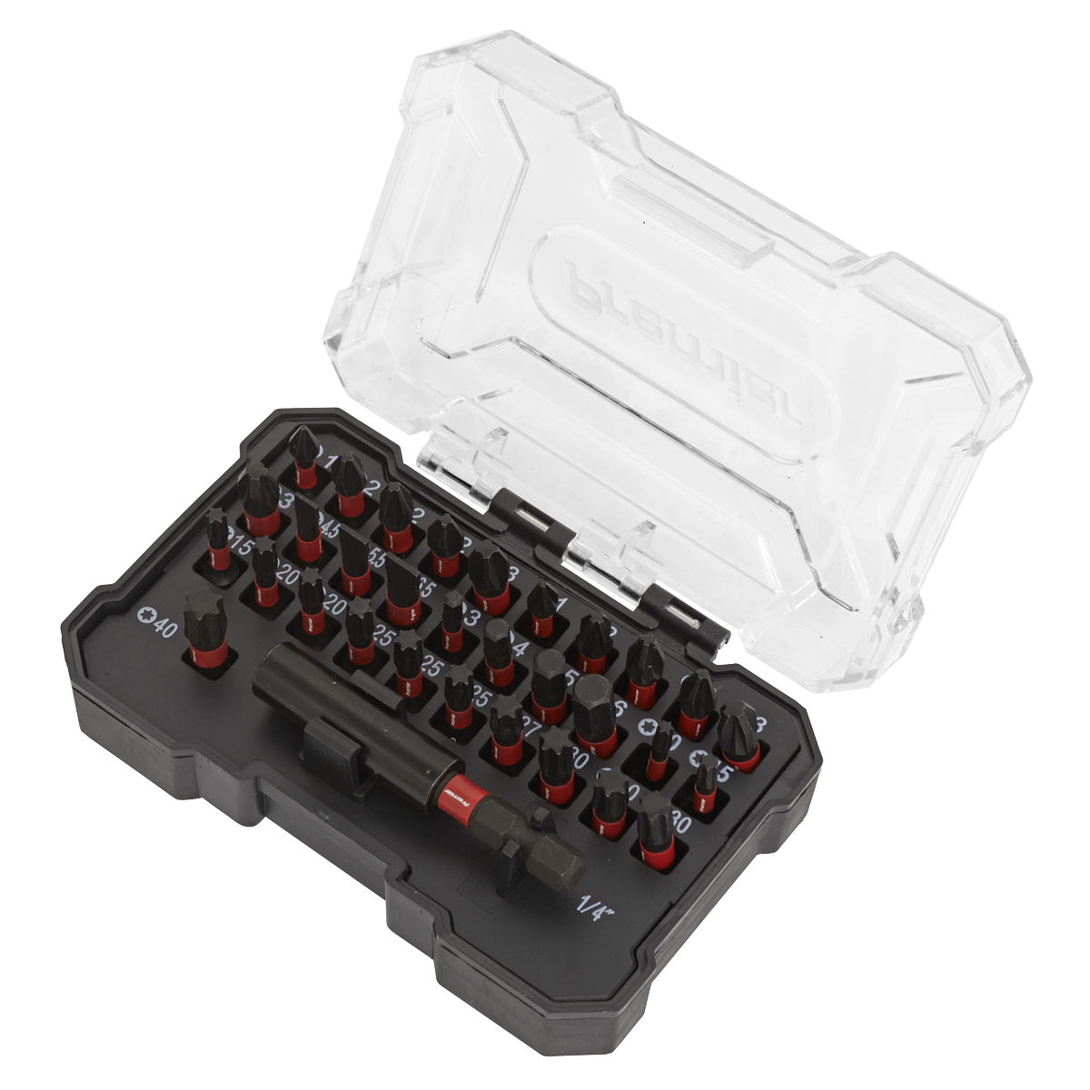 • Contents: 25mm Bits; Slotted - 4.5, 5.5, 6.5mm, Phillips - #1, #2 (x3), #3, Pozi - #1, #2 (x3), #3 (x2), TRX-Star* - T10, T15 (x2), T20 (x2), T25 (x3), T27, T30 (x3), T40, Hex - 3, 4, 5, 6mm, 60mm Bit Holder.