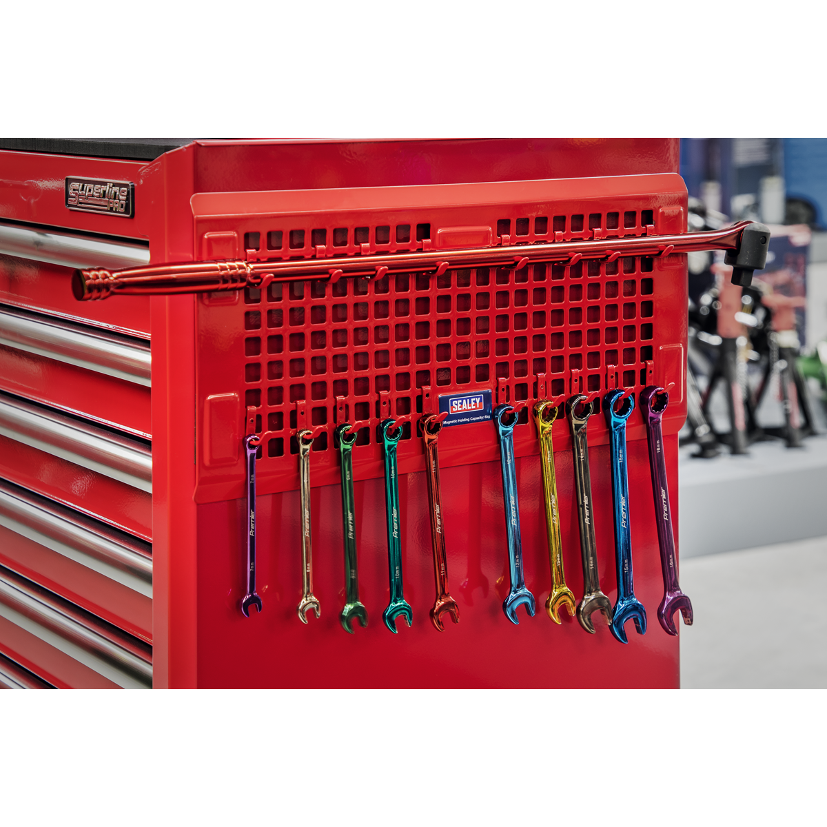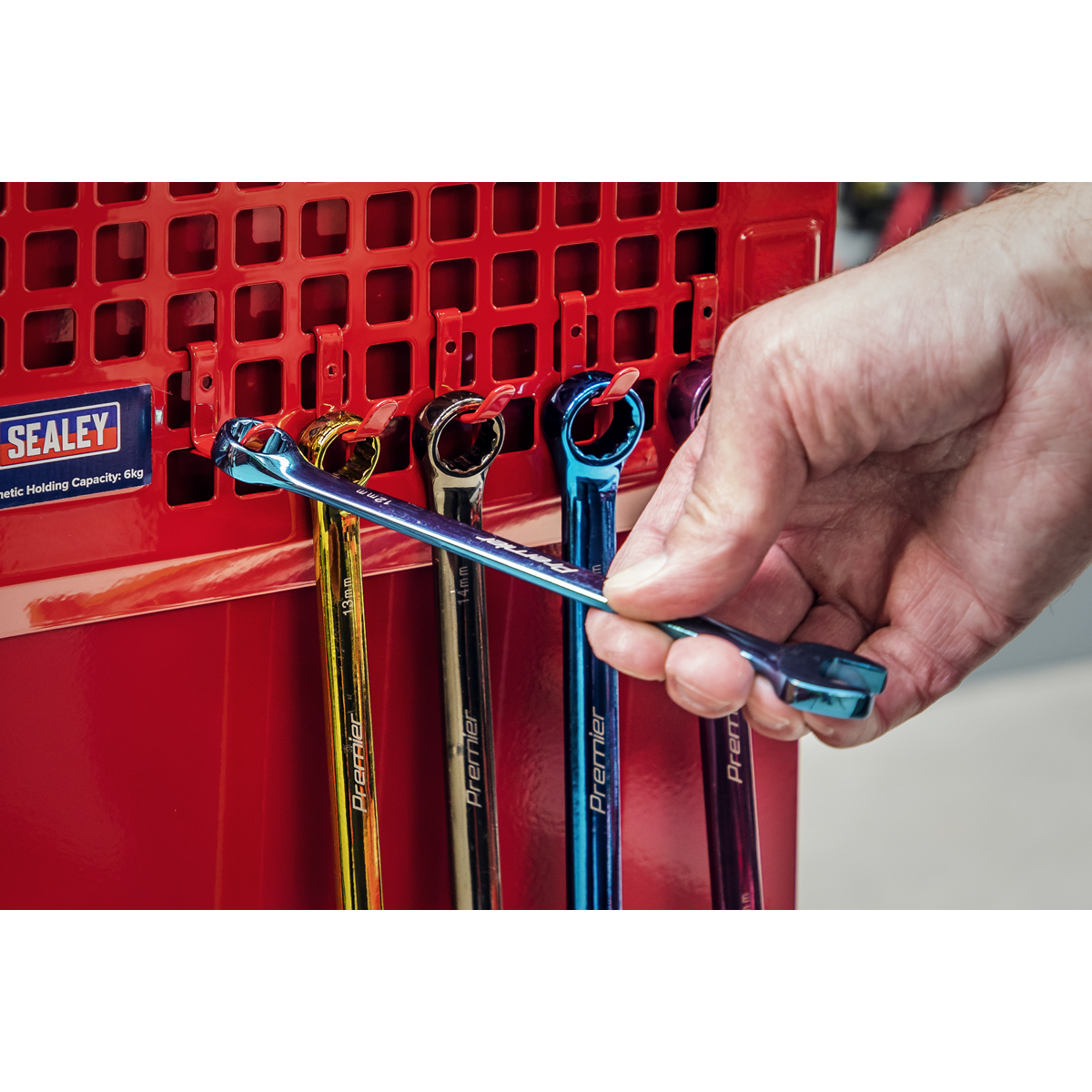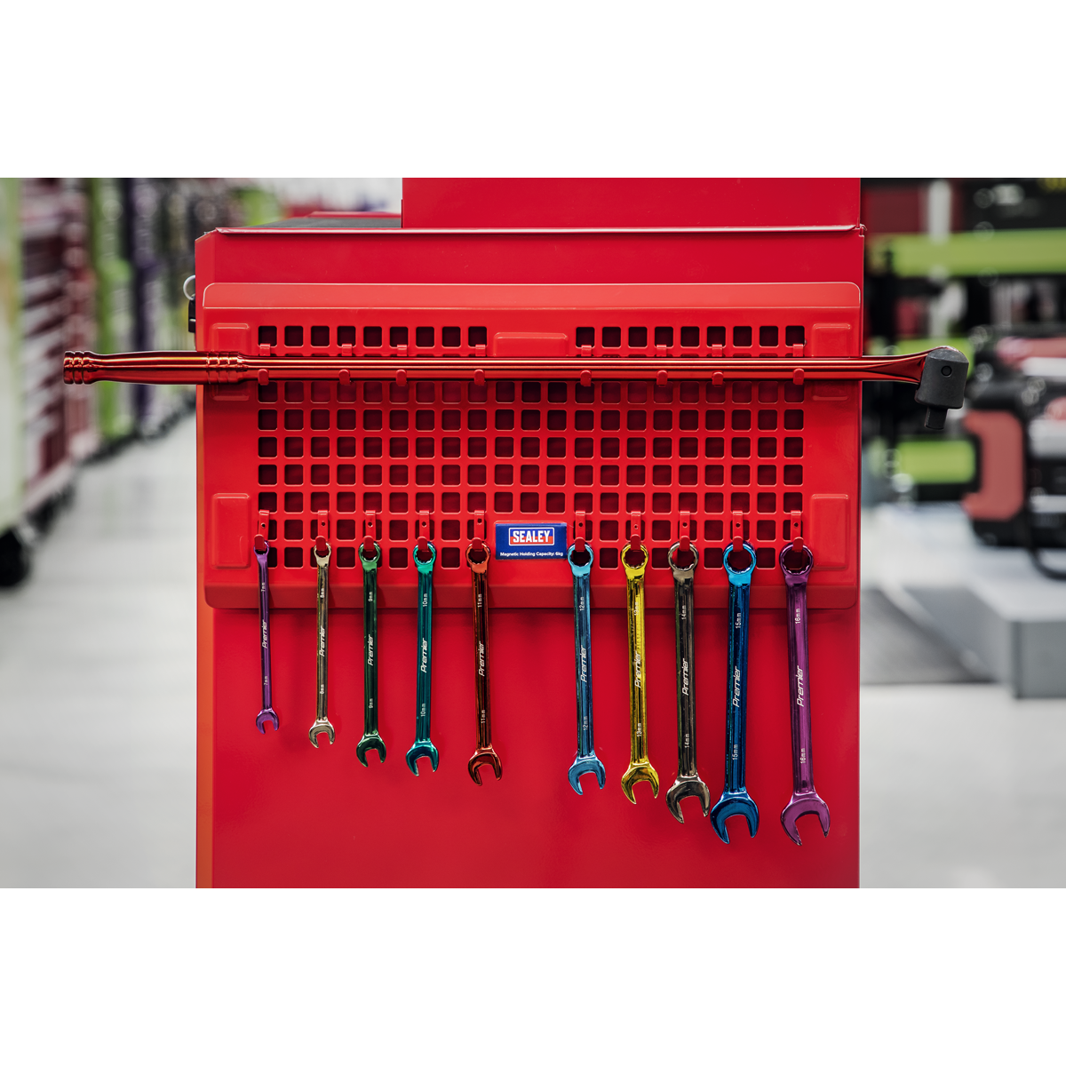 • Magnetic pegboard designed to be attached to any flat ferrous metal surface such as toolboxes and trolleys.