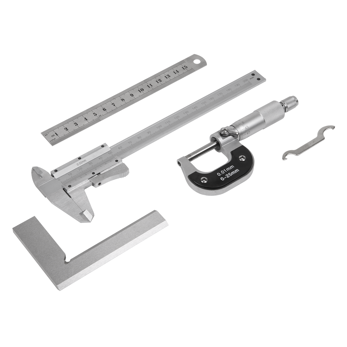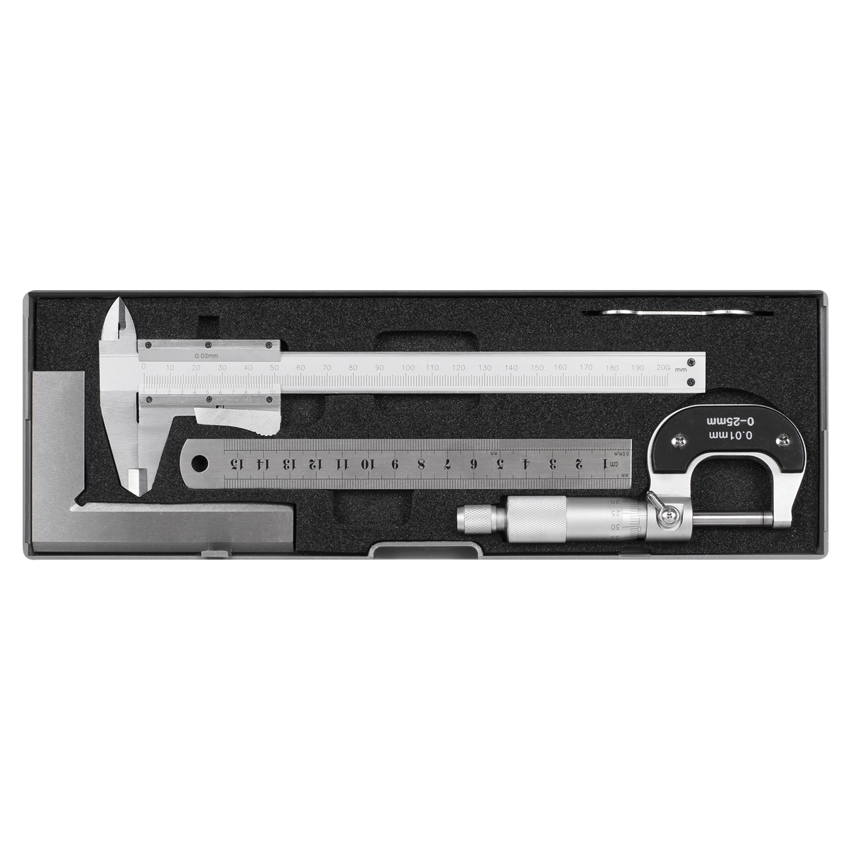 • Contents: 200mm Vernier Caliper, 0-25mm Micrometer, 100 x 70mm Bevelled Edge Square, 150mm(6") Stainless Steel Rule.