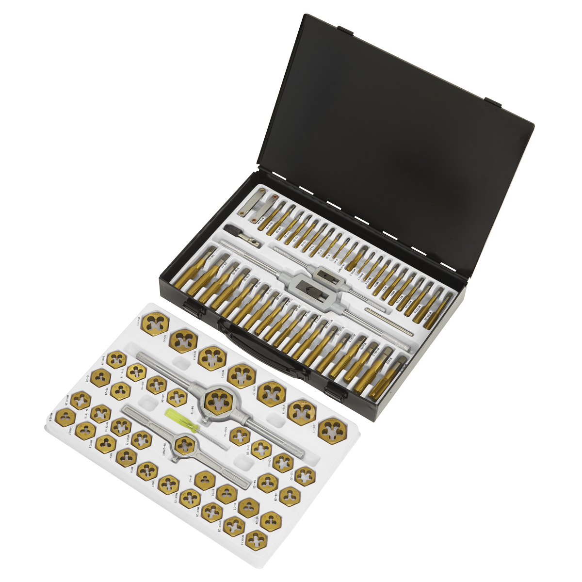 • Contents: Metric Taps & Dies; M3 x 0.5, M4 x 0.7, M5 x 0.8, M6 x 1, M7 x 1, M8 x 1, M8 x 1.25, M9 x 1.25, M10 x 1.5, M10 x 1.25, M11 x 1.5, M11 x 1.25, M12 x 1.5, M12 x 1.75, M14 x 2, M14 x 1.5, M16 x 2, M16 x 1.5, Imperial Taps & Dies; UNC; 4-40, 6-32, 8-32, 10-24, 12-24, 1/4”-20, 5/16-18, 3/8-16, 7/16”-14, 1/2”-13, 9/12”-12, 5/8”-11, UNF; 10-32, 1/4”-28, 5/16”-24, 3/8”-24, 7/16”-20, 1/2”-20, 9/16”-18, 5/8”-18, T-handled Tap Wrench, Double-Ended Tap Wrench, Die Handle, Metric & Imperial, Screwdriver.