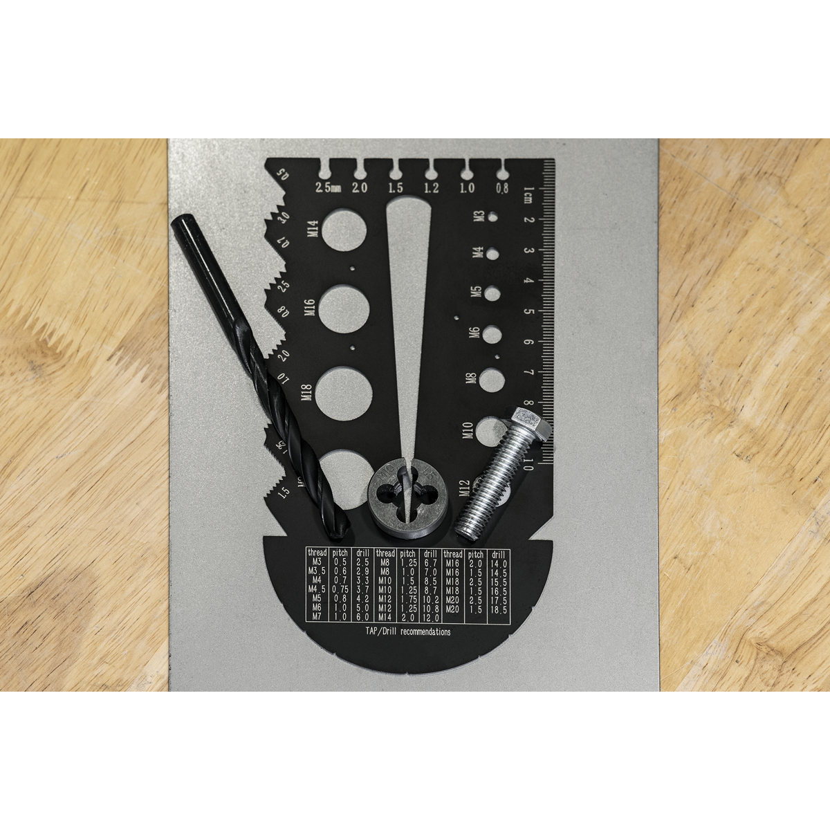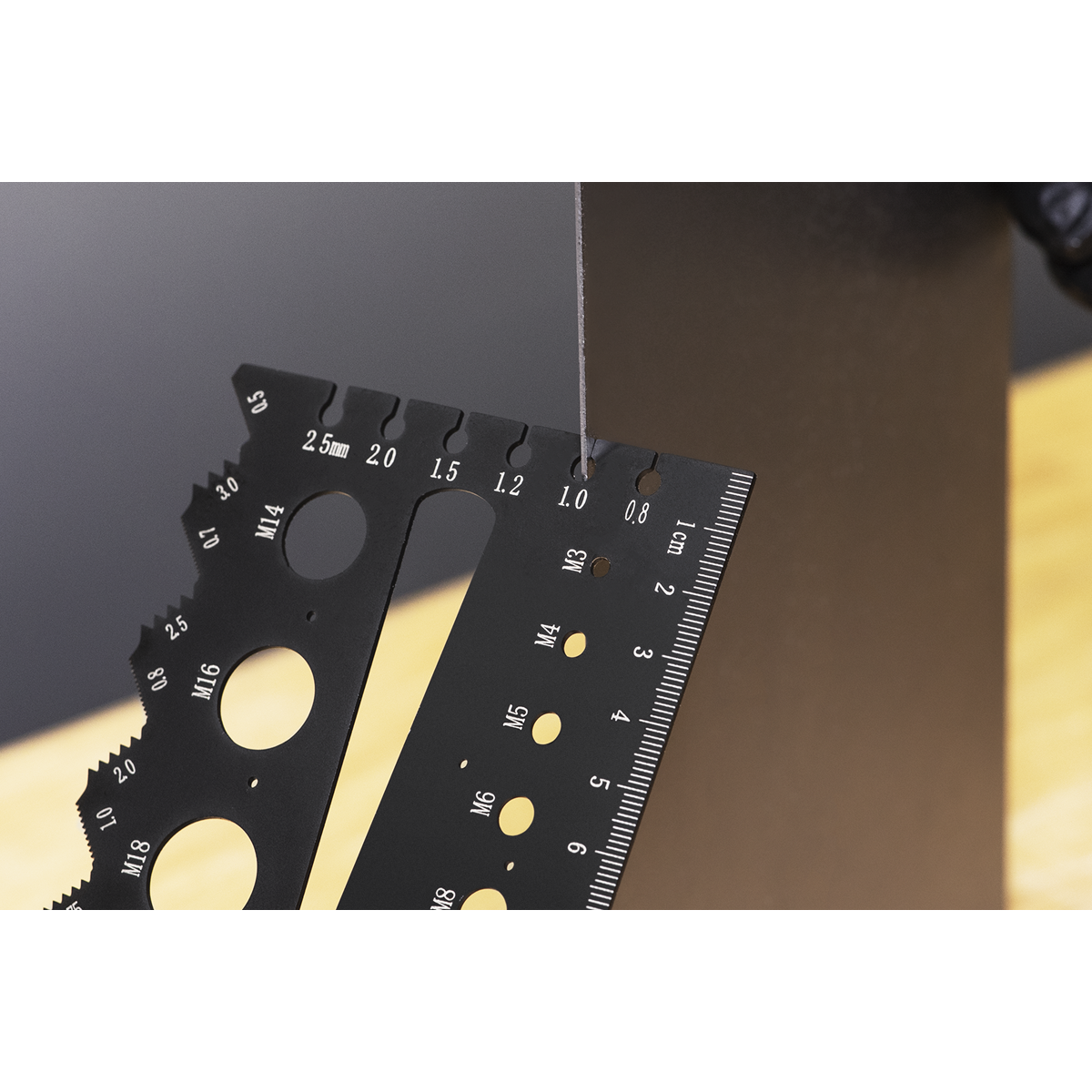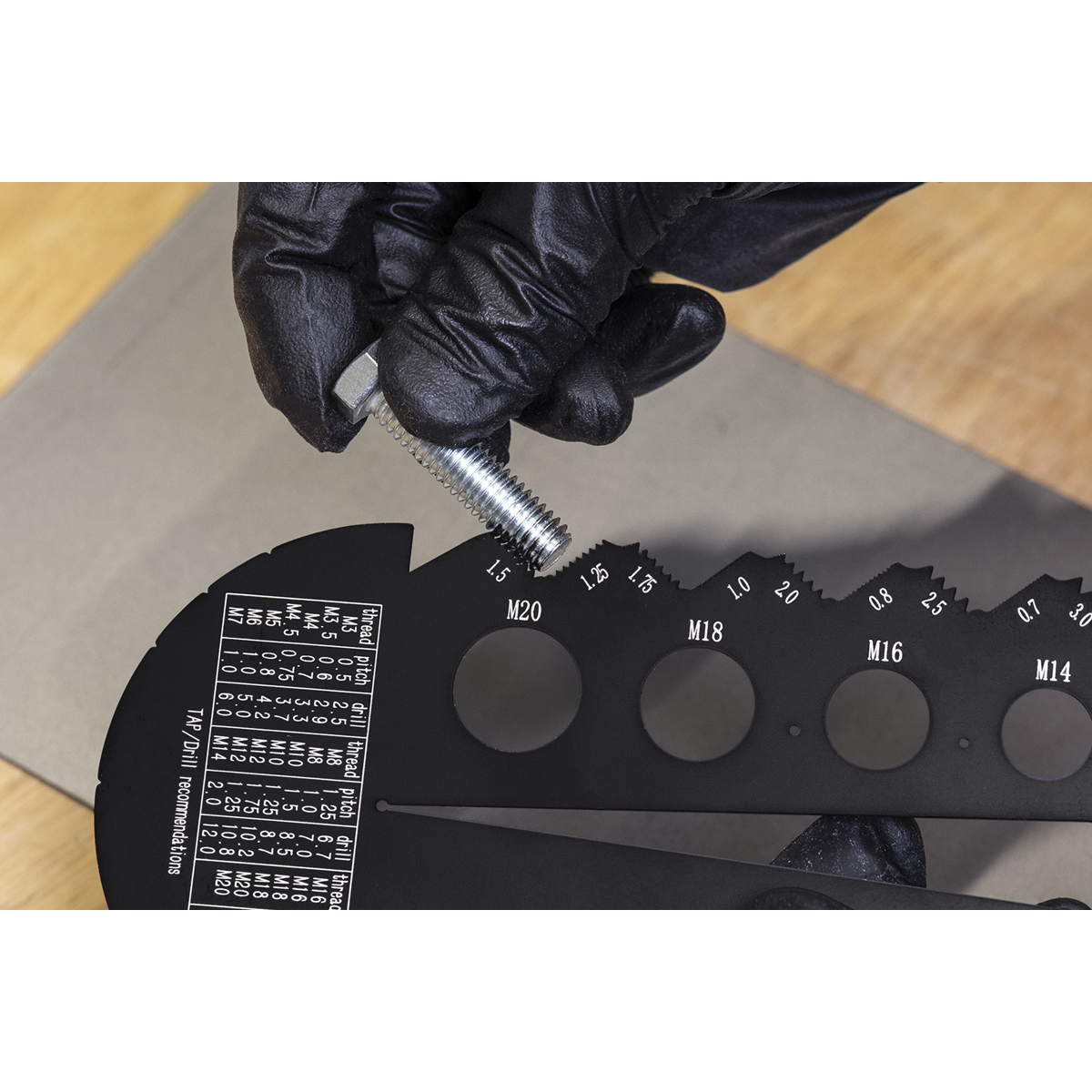 • Stainless steel metric multifunction thread/pitch identification gauge.