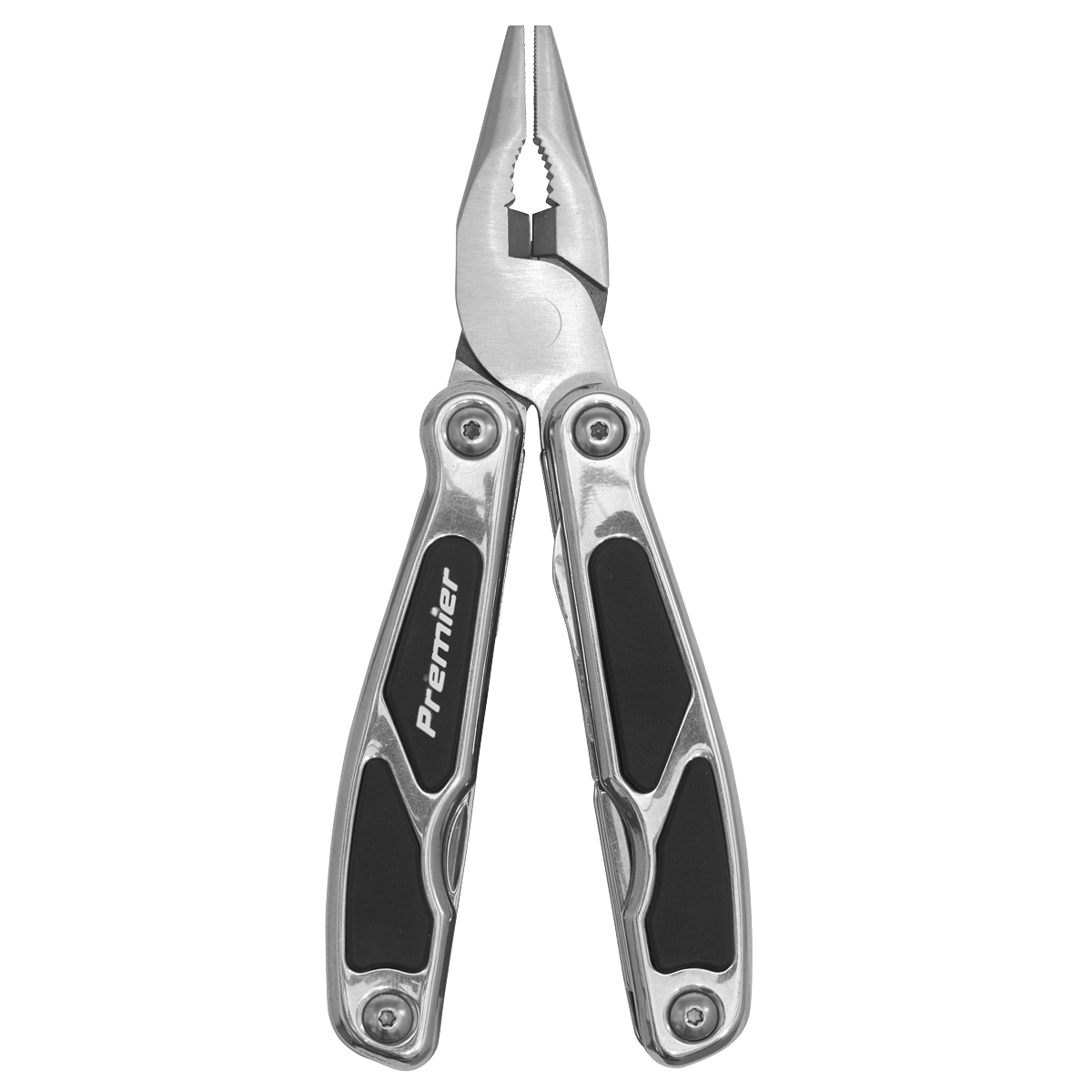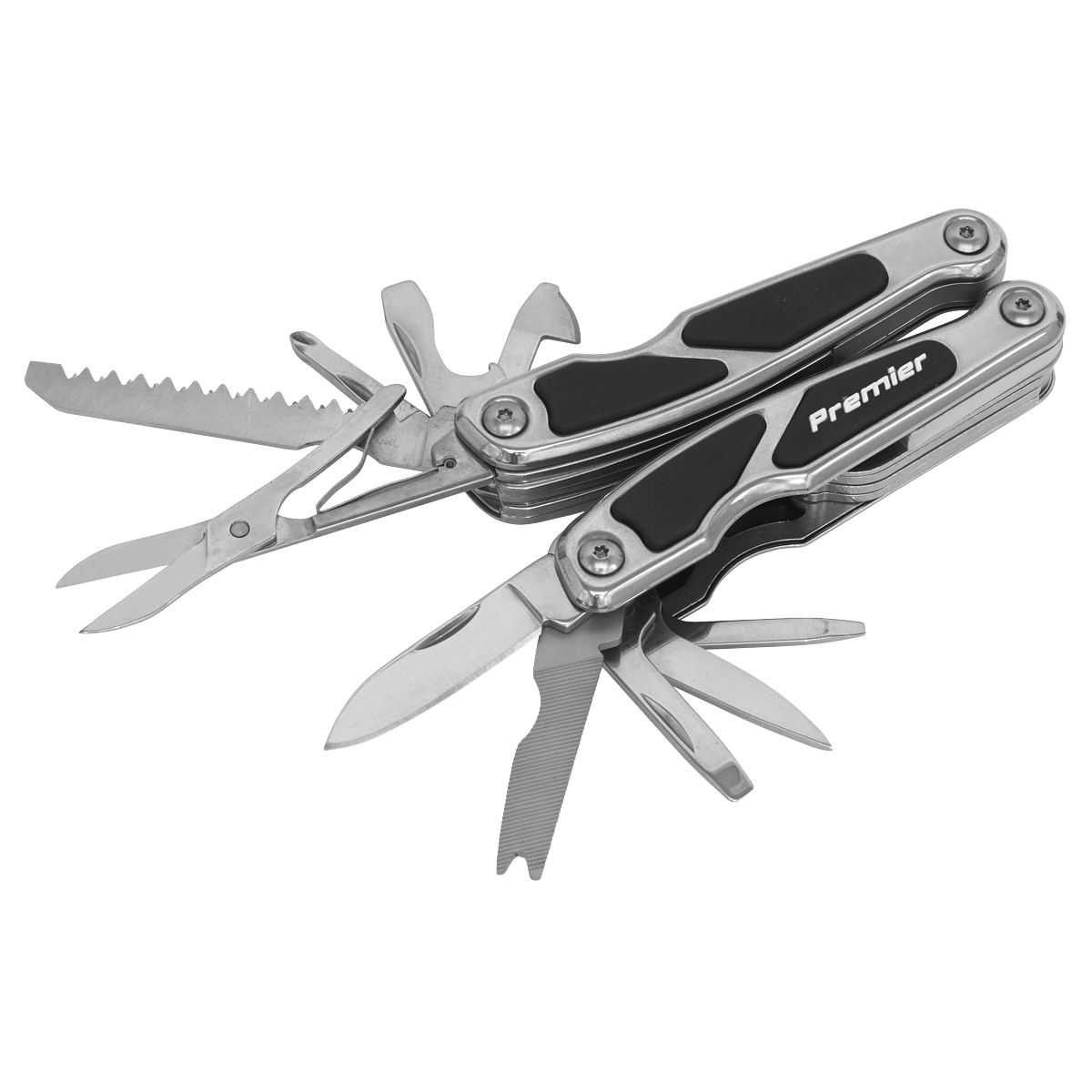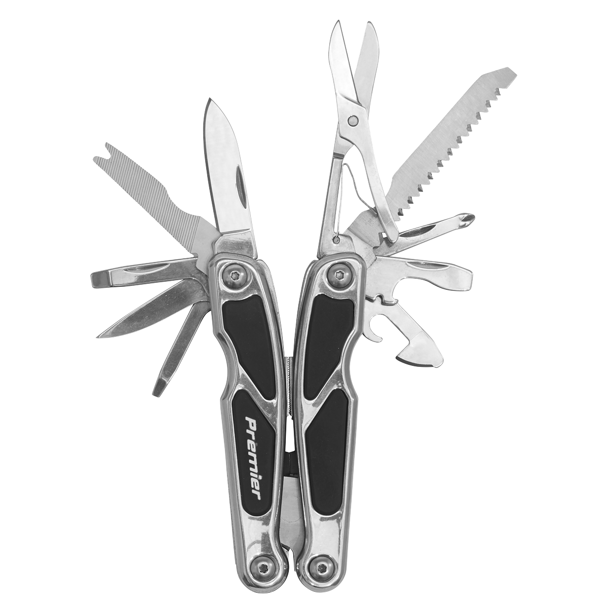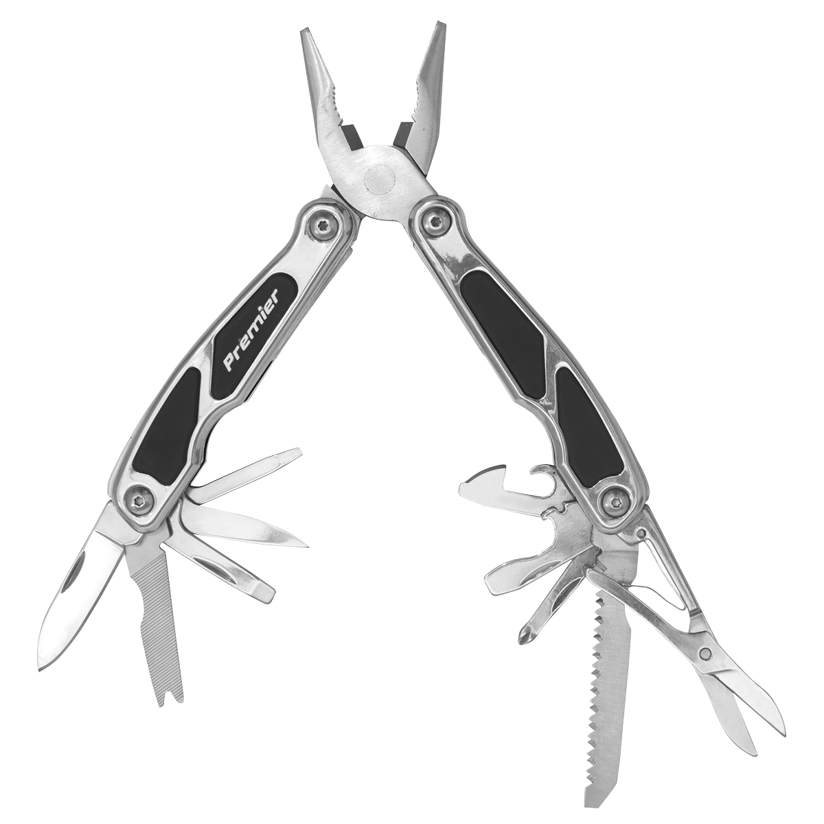 • Multi-tool functions include pliers, wire cutters, scissors, wood saw, leather punch, bottle opener, file with hook remover, can opener, fine edge blade, slotted and Phillips screwdrivers.