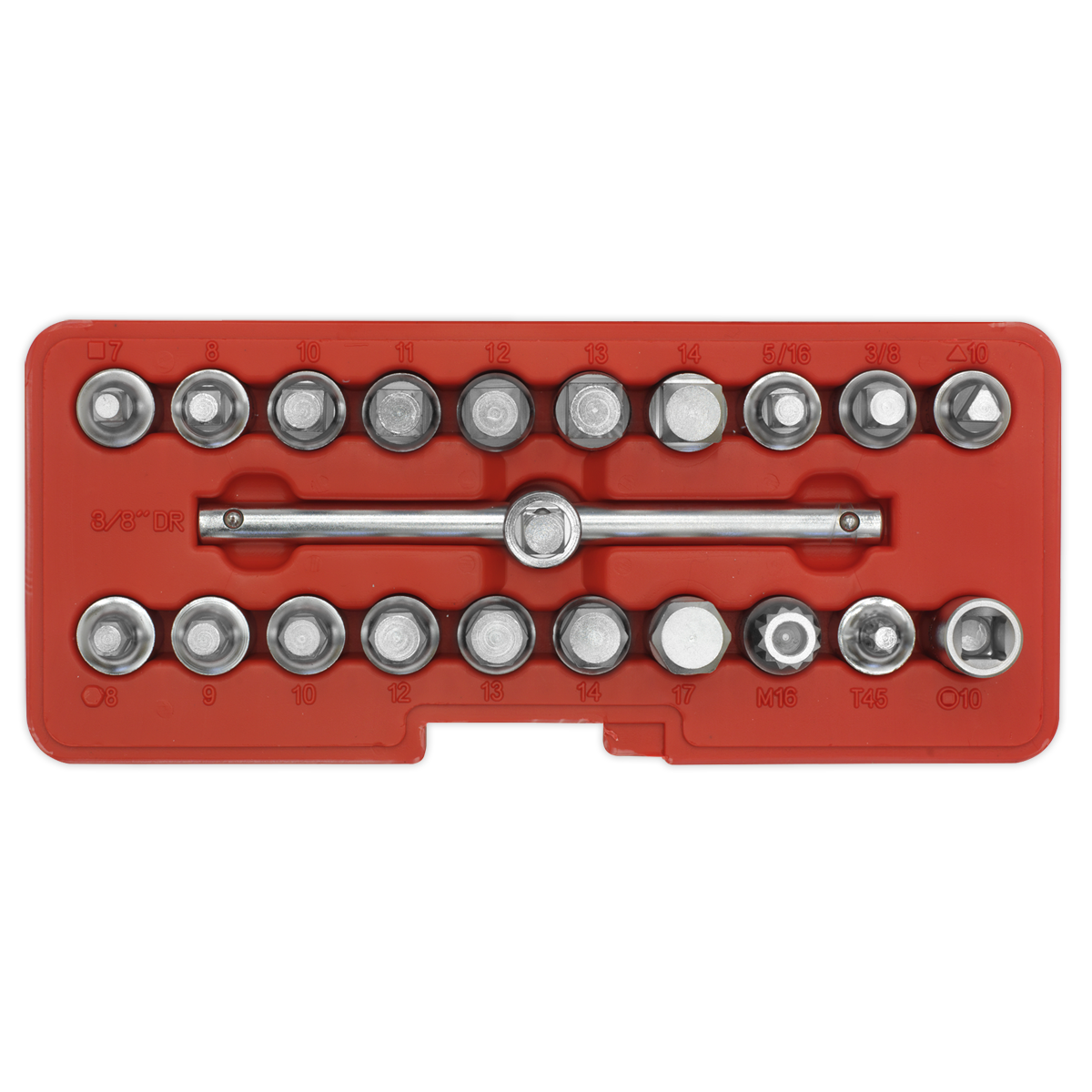 • Contents: Square Male; 7, 8, 10, 11, 12, 13, 14mm, 5/16", 3/8", Square Female; 10mm, Hex; 8, 9, 10, 12, 13, 14, 17mm, Triangle; 10mm (PSA), Security Spline; M16 (VAG), TRX-Star*; T45 (Vauxhall/Opel), 3/8"Sq Drive Sliding T-Bar.