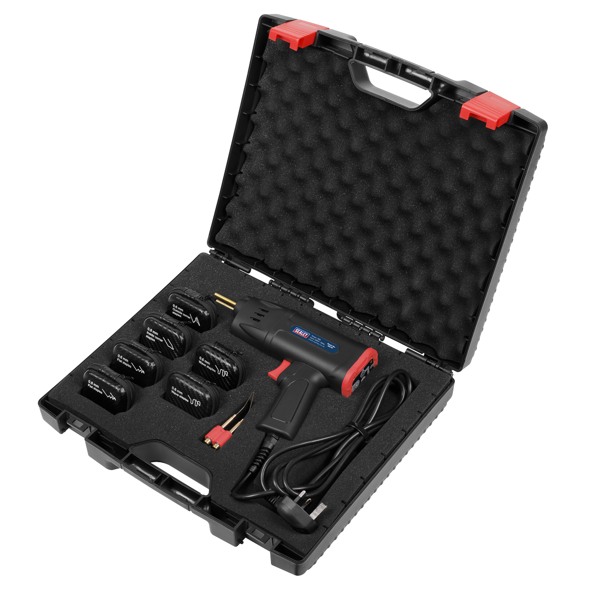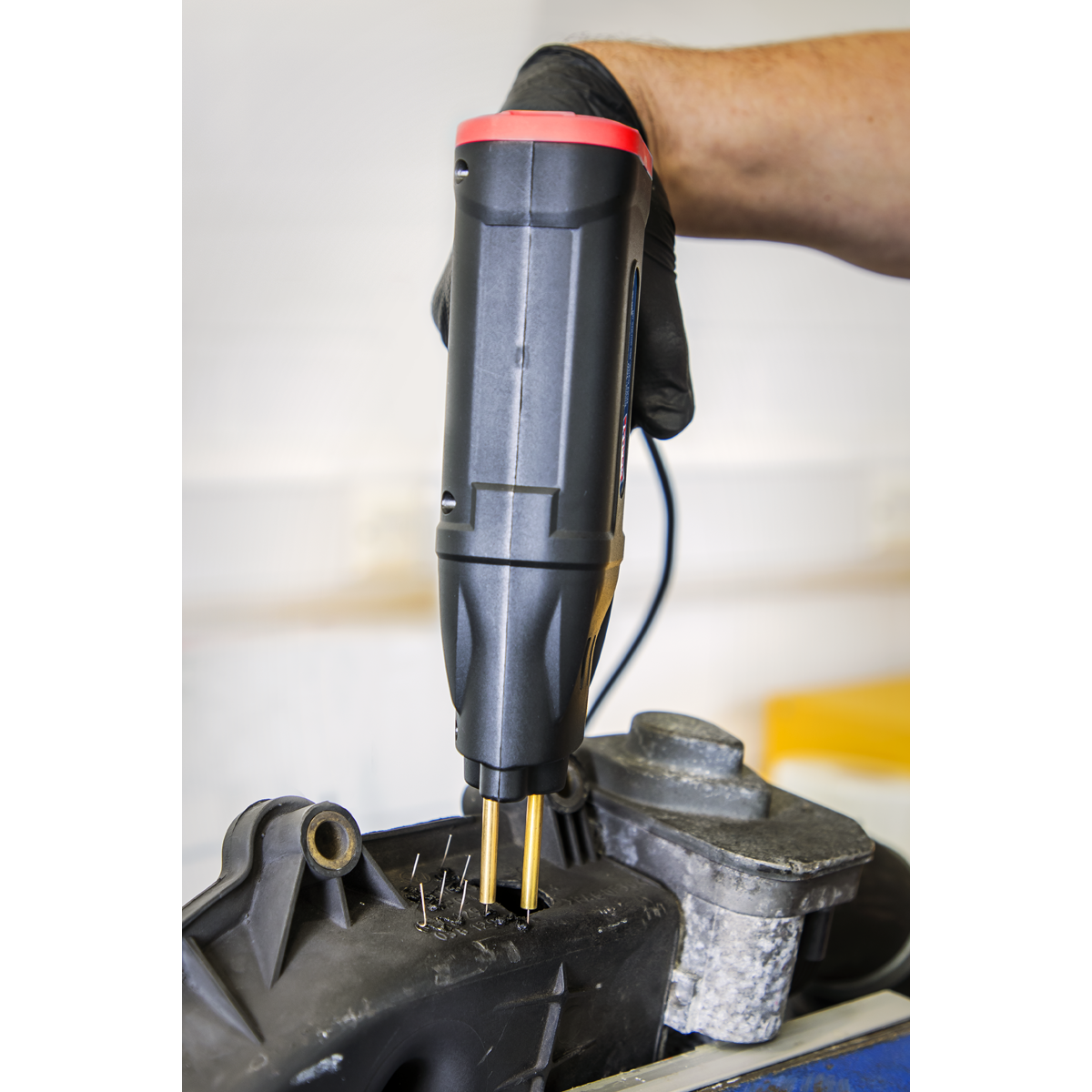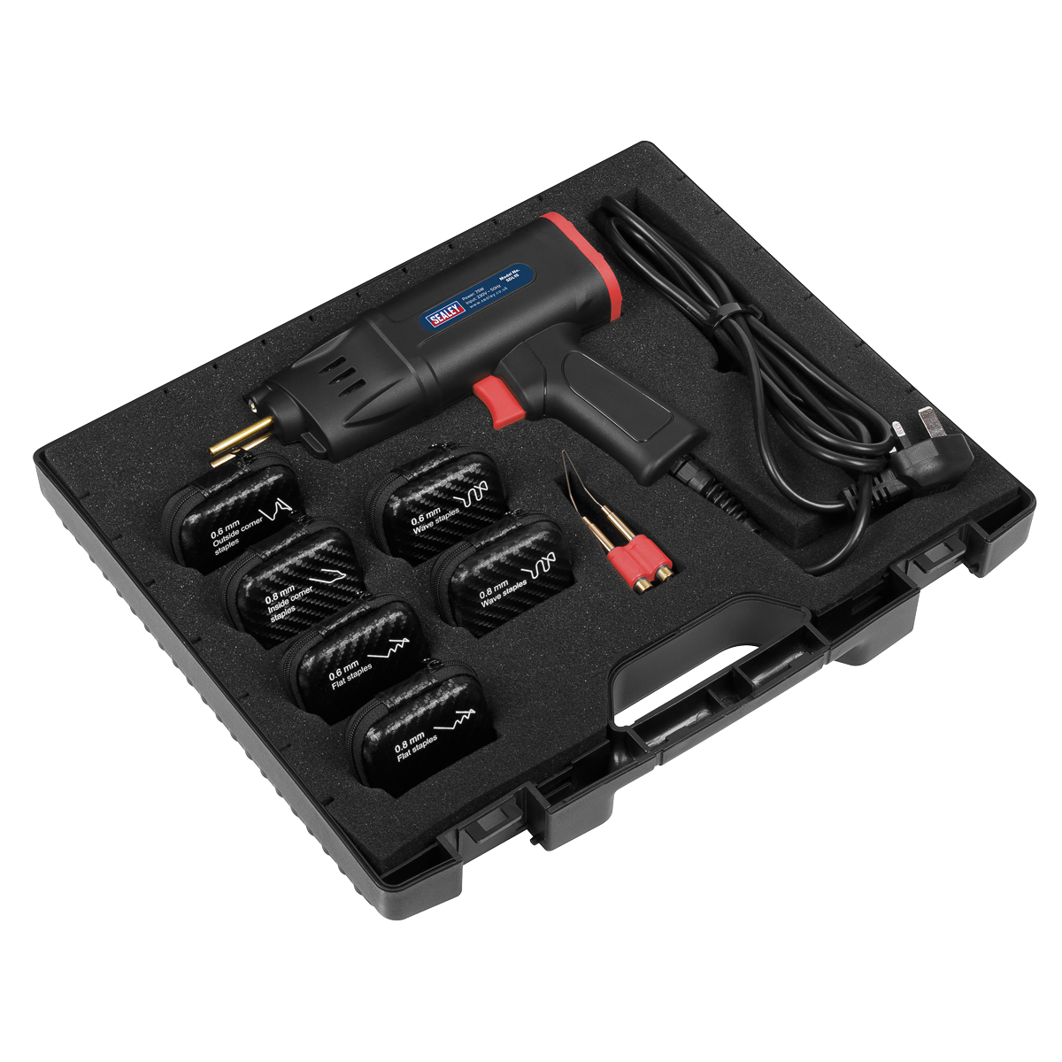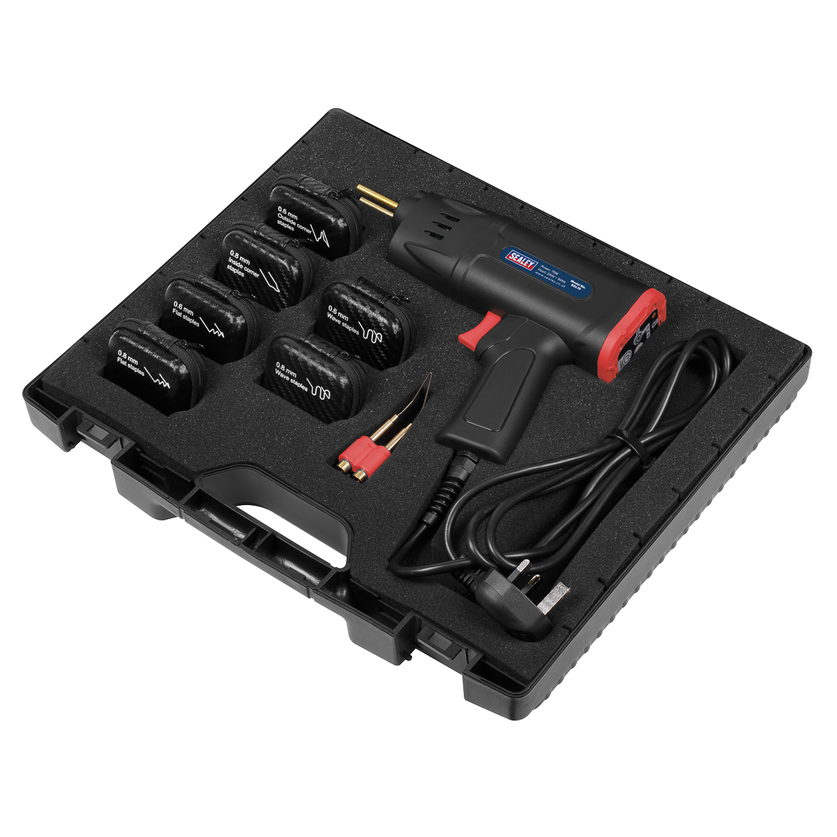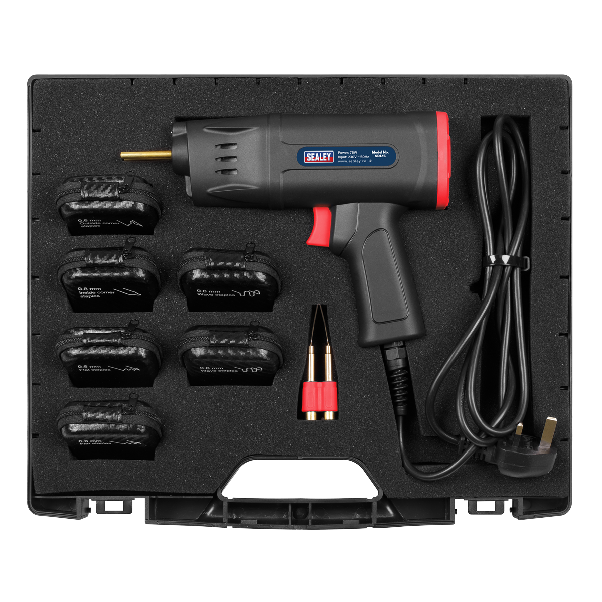 • Kit comprises of staples; 0.6mm outside corner (x50), 0.8mm inside corner (x50), 0.6mm flat (x50), 0.8mm flat (x50), 0.6mm wave (x50), 0.8mm wave (x50), soldering iron tip (x1), heat gun (x1).