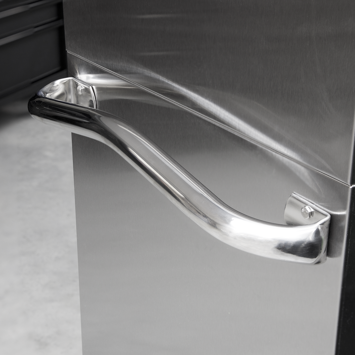 • All drawers have full width sand blasted aluminium 'Lift & Latch' drawer pulls, making easy-access while preventing inadvertent opening when box is being moved.