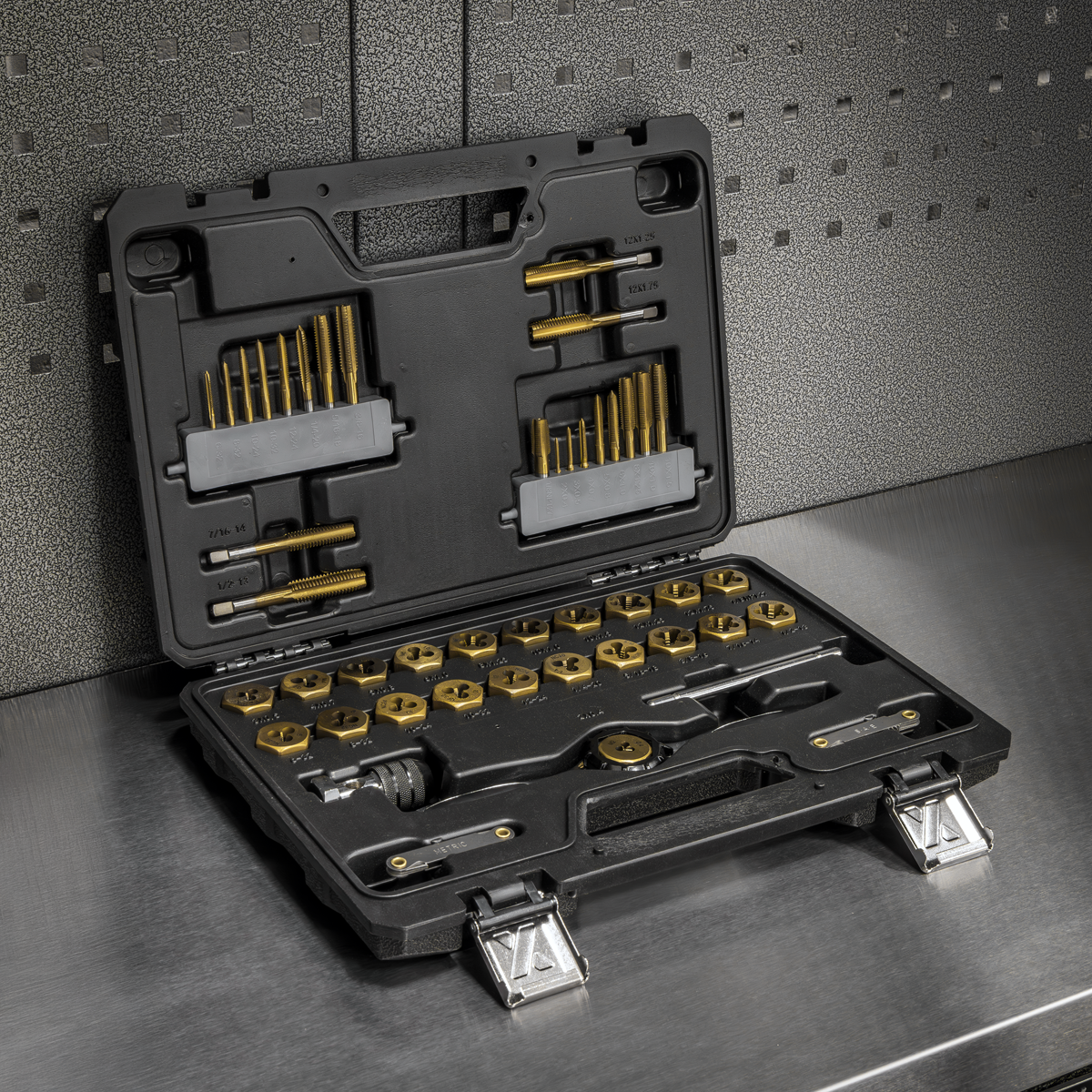 • CONTENTS - Metric Taps & Dies; M2 x 0.4, M3 x 0.5, M4 x 0.7, M5 x 0.8, M6 x 1, M8 x 1.25, M10 x 1.5, M10 x 1, M12 x 1.75, M12 x 1.25, Imperial Taps & Dies; UNC; 6-32, 8-32, 10-24, 12-24, 1/4"-20, 5/16"-18, 3/8"-16, 7/16"-14, 1/2"-13, UNF; 10-32, 2-in-1 T-Type Tap Wrench, 2pc Thread Gauge.