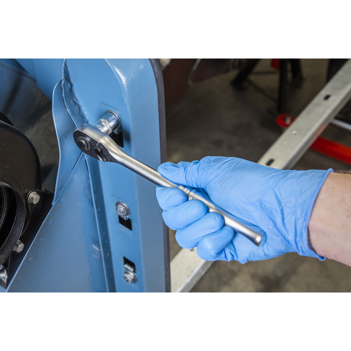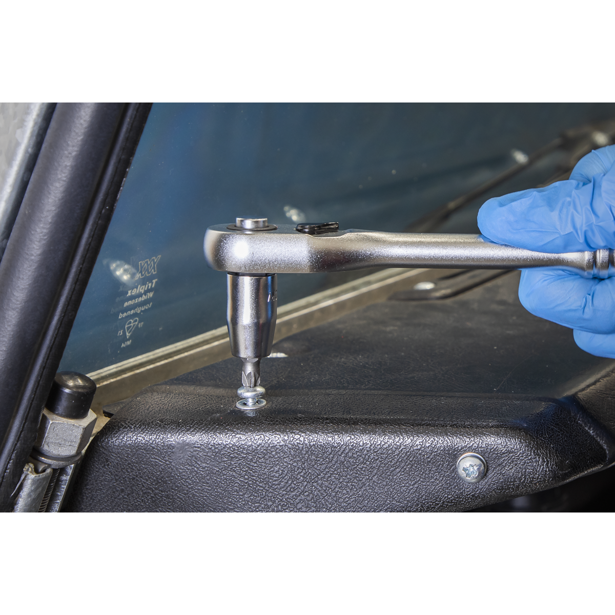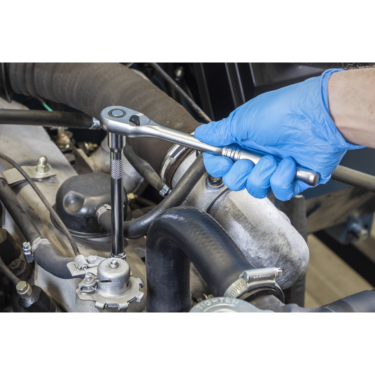 • 90-TOOTH RATCHET – Features 90-tooth ratchet wrench with push button quick release, extension bars, universal joint and adaptors.