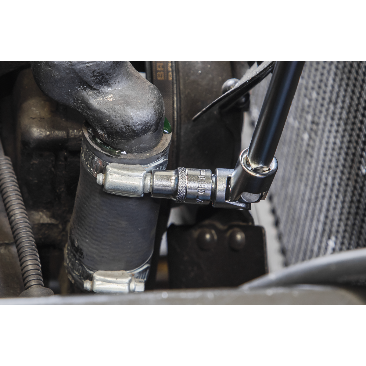 • 90-TOOTH RATCHET – Features 90-tooth ratchet wrench with push button quick release, extension bars, universal joint and adaptors.