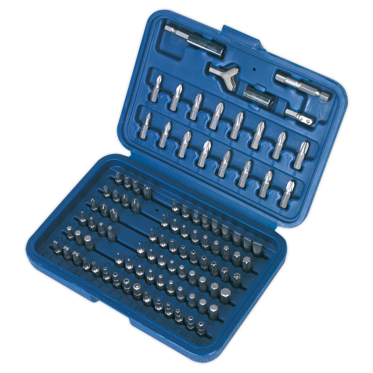 • Contents: Bits; Slotted Screwdriver (x9), Phillips Screwdriver (x8), Pozi Screwdriver (x8), TRX-Star* (x9), Security TRX-Star* (x9), Hex - Metric (x9), Hex - Imperial (x9), Security Hex - Metric (x6), Security Hex - Imperial (x6), Butterfly (x3), Spanner (x4), Spline (x3), Square (x4), Torq (x3), Tri-Wing (x4), Special Hook Bit, Magnetic Extension/Bit Holder, 1/4"Sq Drive Extension, 1/4"Sq Drive Socket Adaptor (x2).