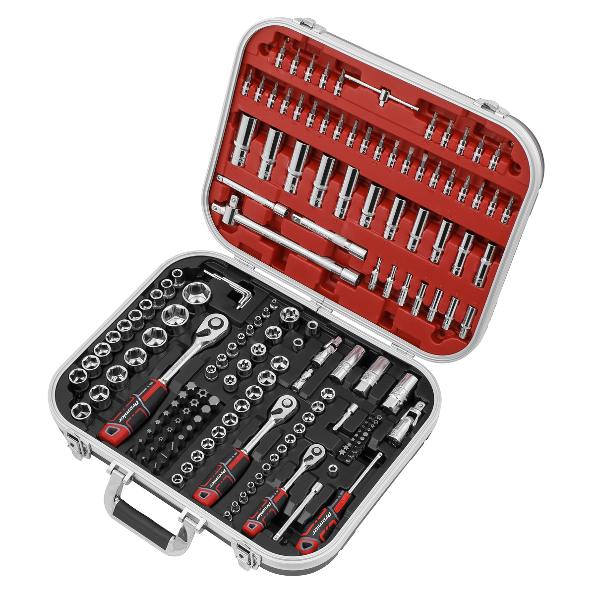 • Includes comfort grip ratchet wrenches, chrome plated spark plug sockets, extension bars, female TRX-Star* sockets, socket bits, hex keys, bits, spinner handle, sliding T-Bar, hex adaptors and accessories.
