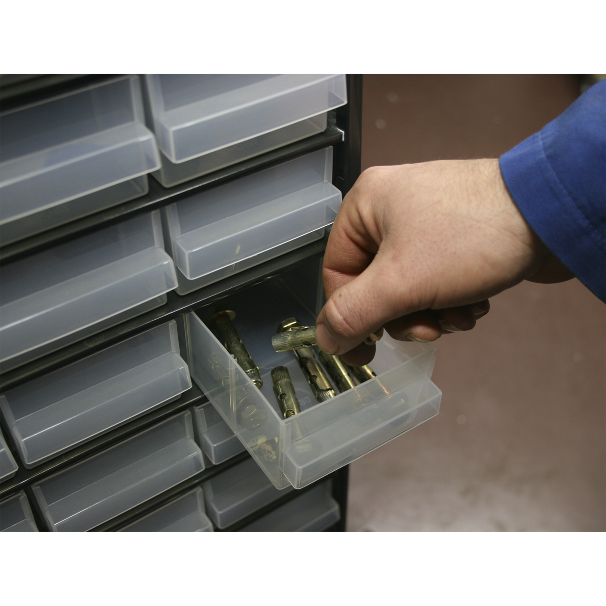 • Freestanding rotating cabinet system featuring twelve cabinet boxes with three different drawer configurations.