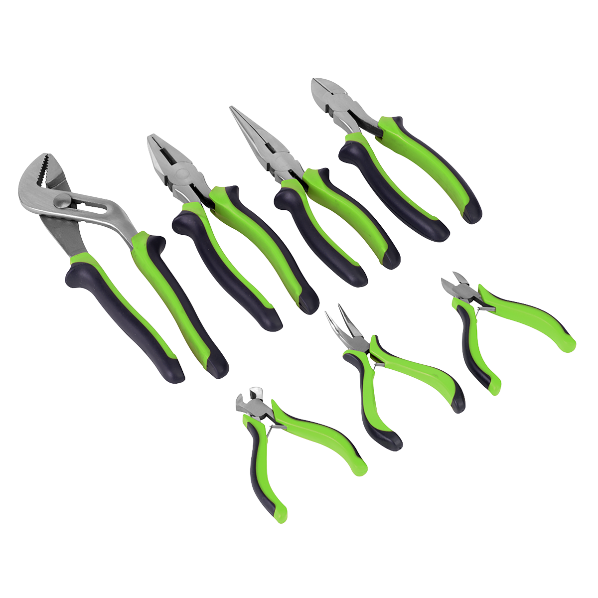 • 7PC SET - Contents: Side Cutters; 115mm, 195mm, Long Nose Pliers; 45° x 125mm, Straight x 205mm, 105mm End Cutters, 210mm Combination Pliers, 250mm Water Pump Pliers.