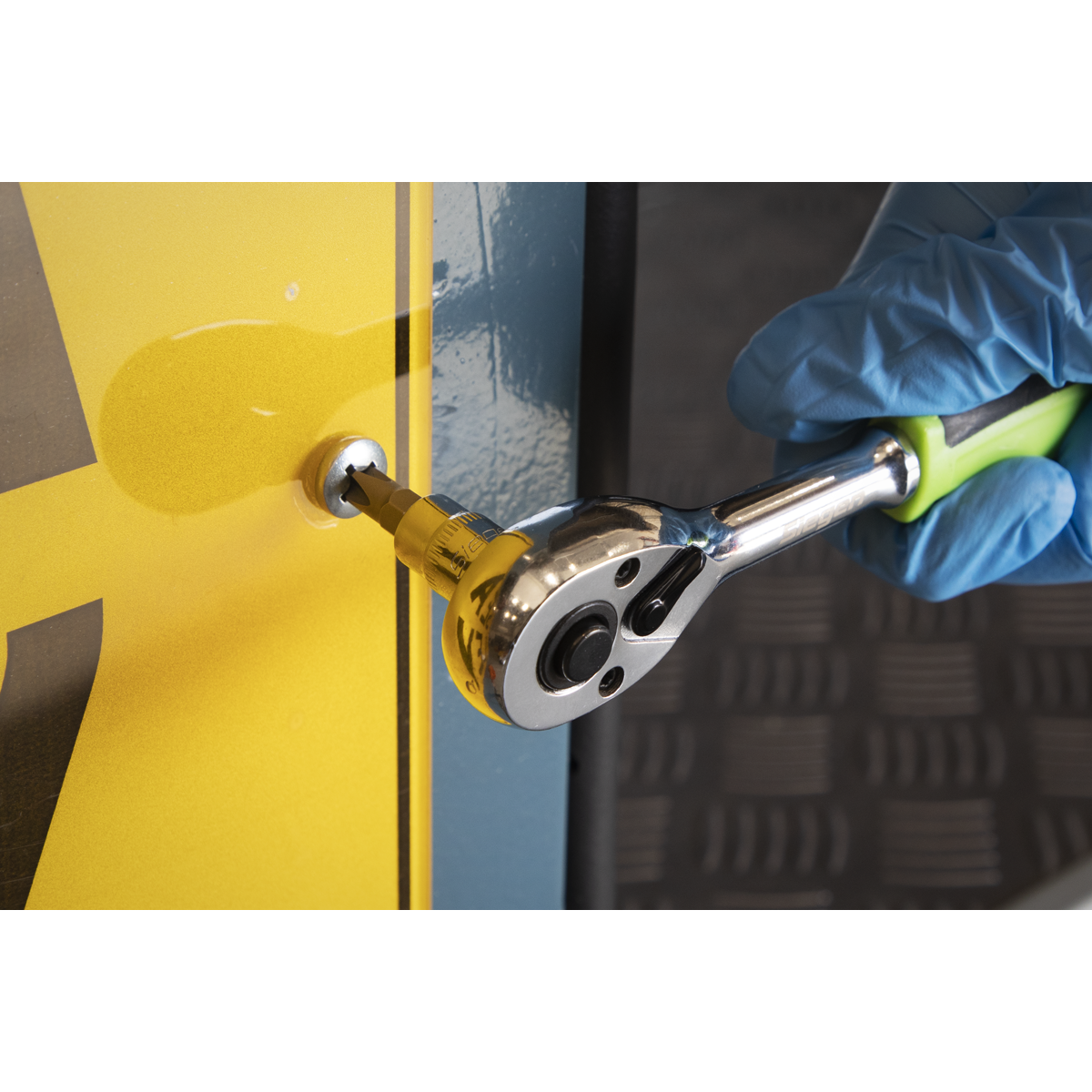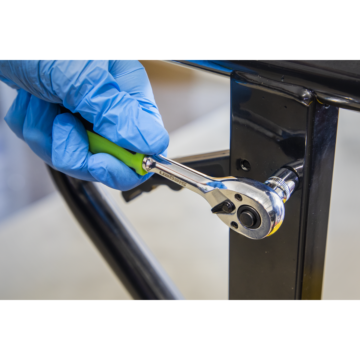 • 72-Tooth pear-head flip reverse ratchet wrench with quick socket release and comfort grip handle.