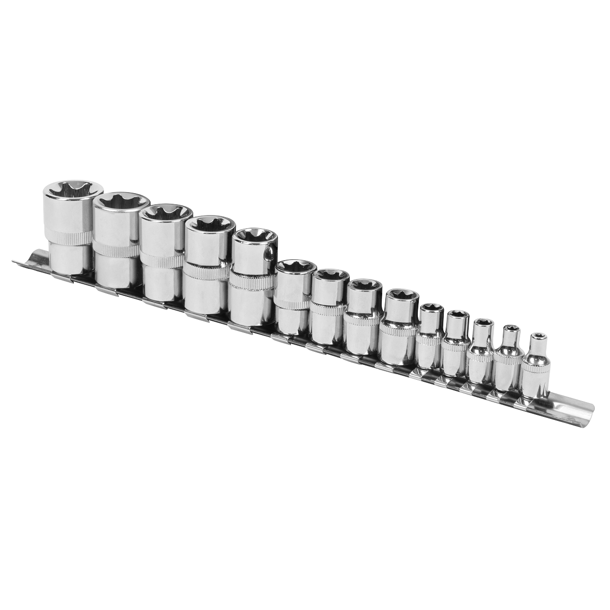 • 14PC SET WITH 3 DRIVE TYPES - Sizes: 1/4"Sq Drive; E4-E8, 3/8"Sq Drive; E10-E14, 1/2"Sq Drive; E16-E24.