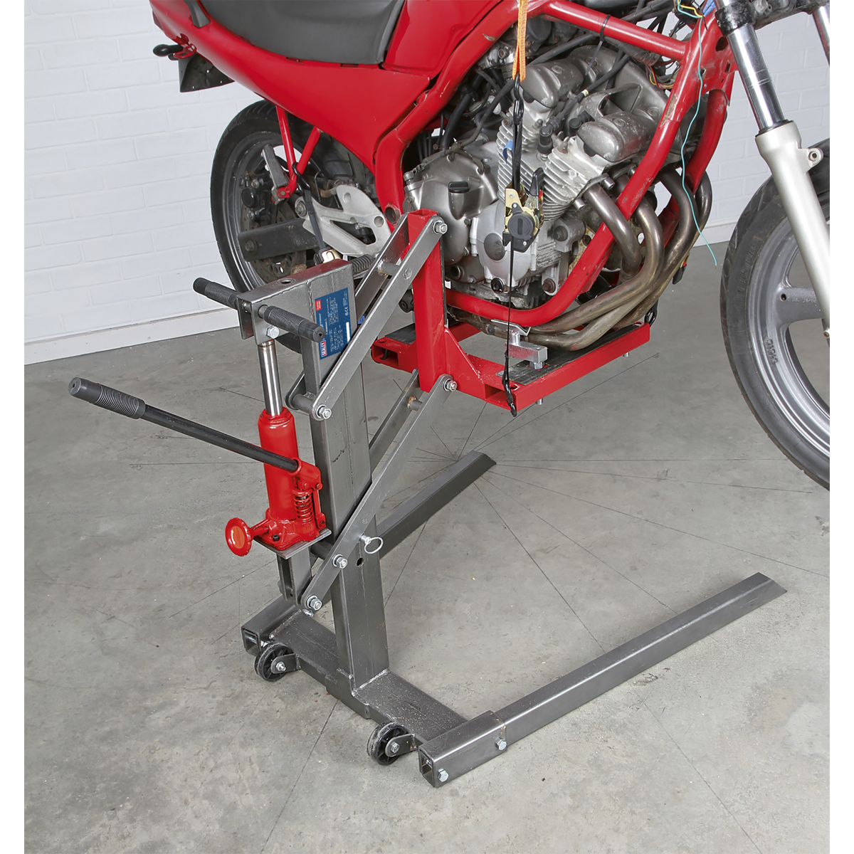 • With this lift it is possible to remove both wheels, front forks, steering assembly, rear swing arm and suspension units as well as the engine.