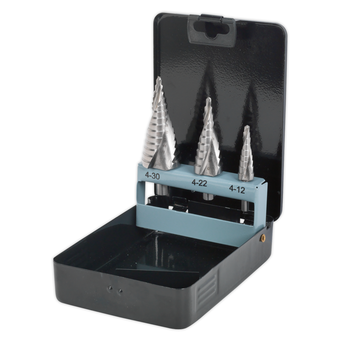 • Three high-speed HSS 4341 double spiral flute step drills.