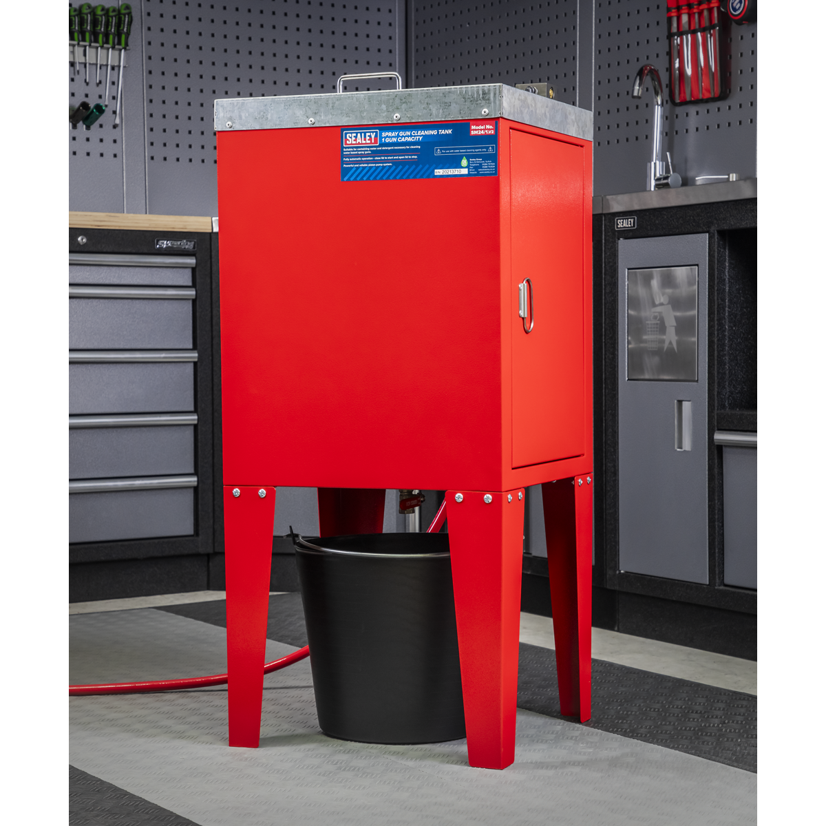• Corrosion resistant tank suitable for containing water and detergent necessary for cleaning water based spray guns.