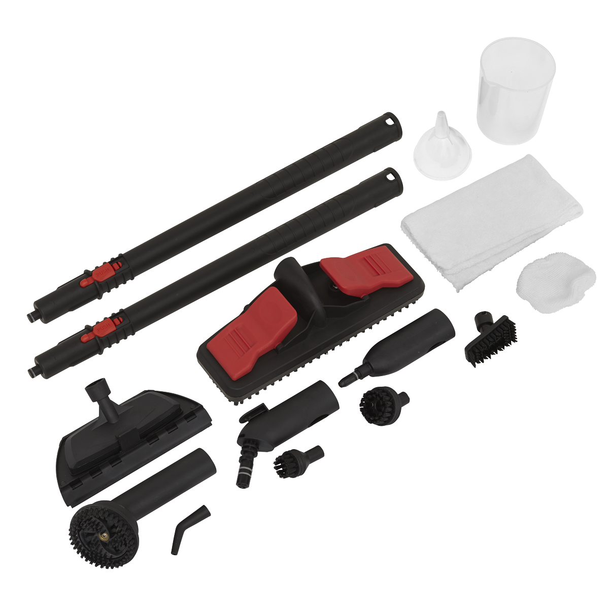• Standard Accessories: 2pc Extension Tube, Floor Scrub Brush, Floor Scrub Brush Cleaning Cloth, Floor Scrub Brush Adaptor, Small Tip Adaptor, Medium Brush, Small Brush, Small Power Jet Tip – Angled, Rotating Brush, Window Squeegee, Cloth for Window Squeegee, Wave Brush, Funnel and Measuring Jug.
