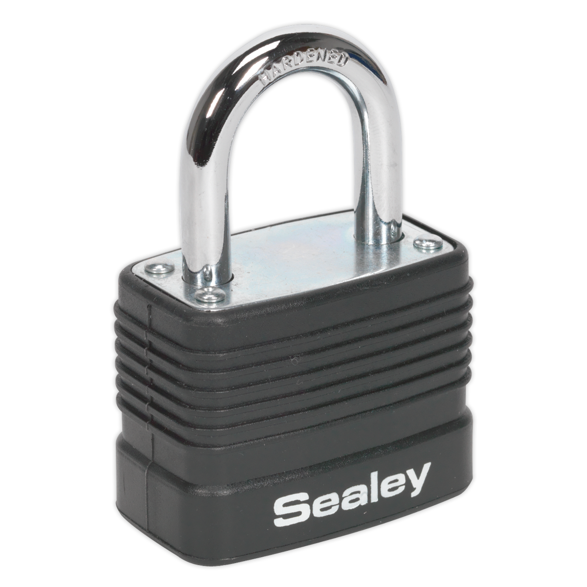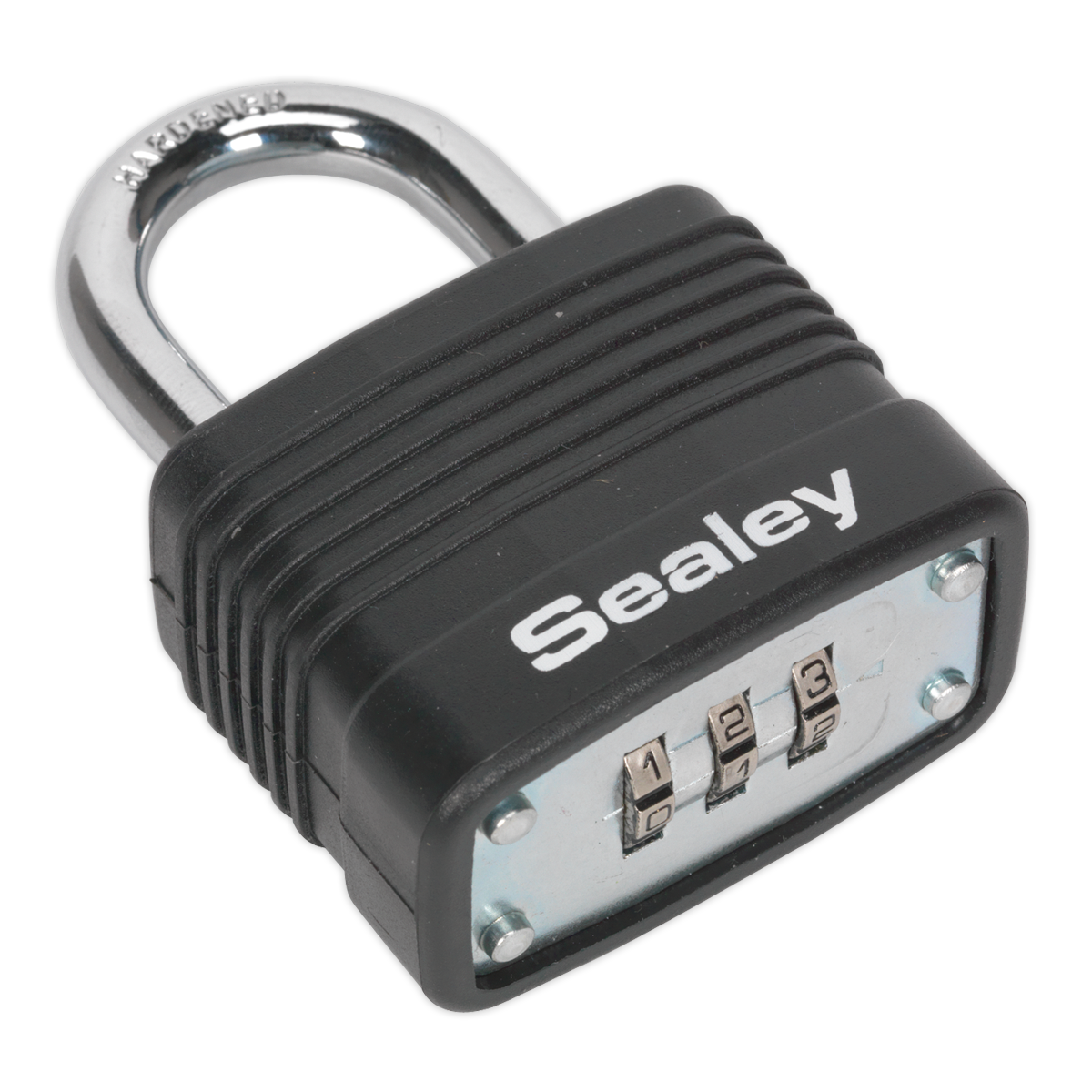 • Laminated steel body combination padlock with steel chrome finished shackle.